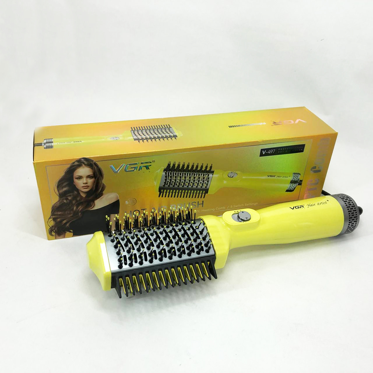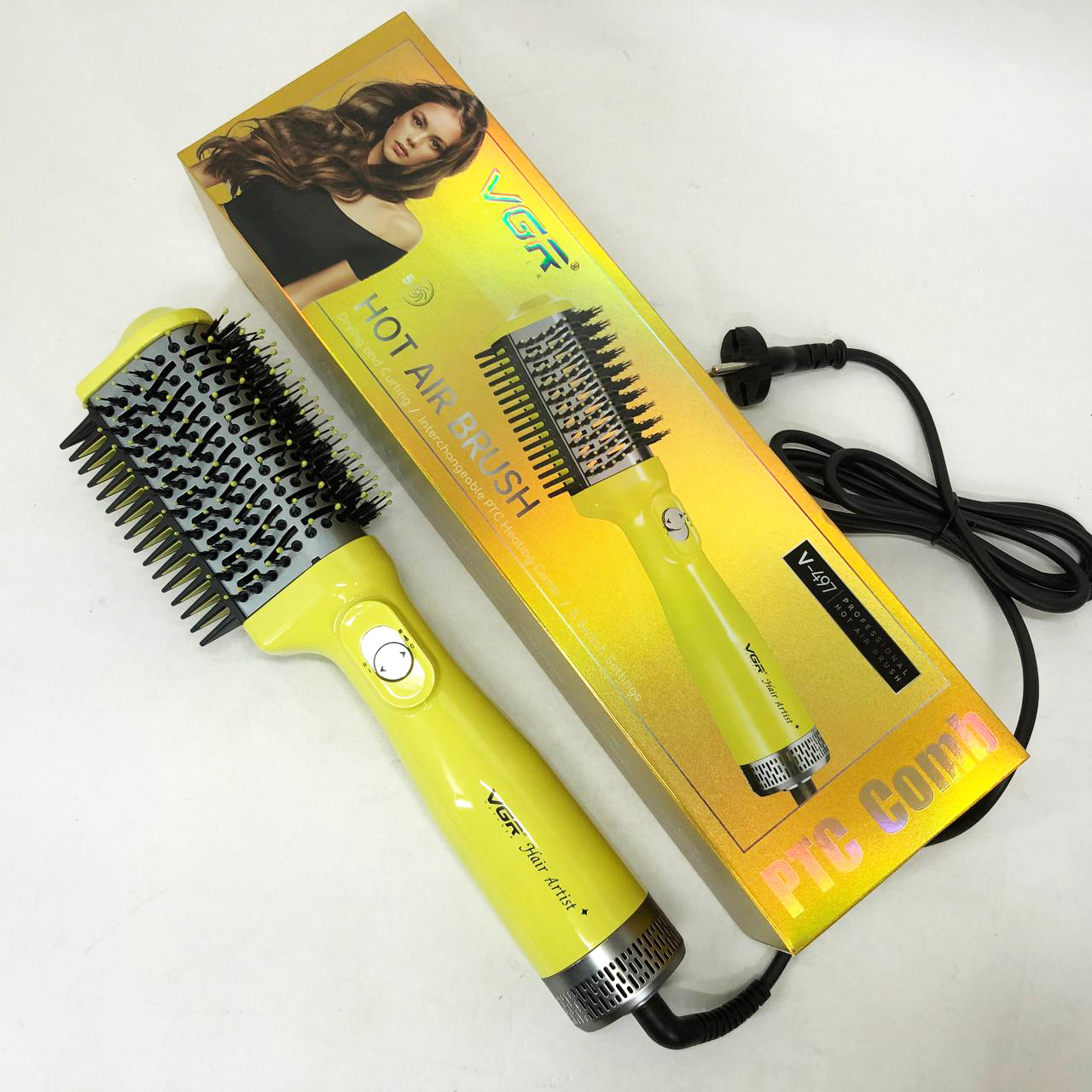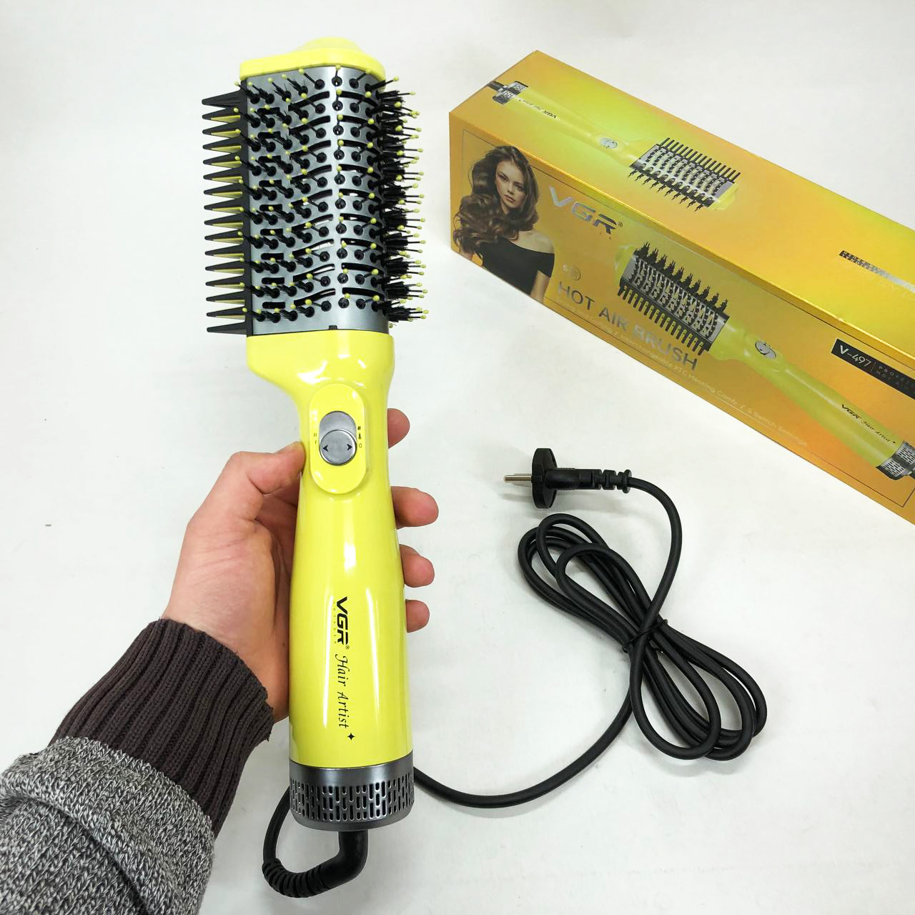 Фен-щітка для волосся VGR V-497– пристрій, який може замінити одночасно плойку, праску та фен. Він може використовуватися для сушіння волосся та моделювання зачісок, вирівнювання пасм та створення ефектних укладок. Мультистайлер має поворотну насадку з керамічним покриттям, завдяки чому виключено перегрів та пошкодження локонів.