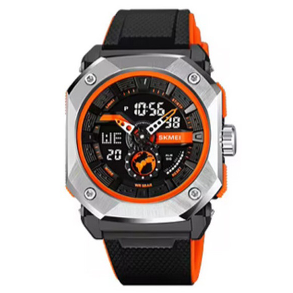 SKMEI 2272BKOG — це спортивний годинник із яскравим дизайном, що миттєво привертає увагу. Контрастне поєднання чорного, помаранчевого та металевого кольорів робить його не лише стильним аксесуаром, а й потужним функціональним інструментом. Модель має масивний корпус геометричної форми, комбінований дисплей і агресивний характер, що підкреслює динамічний стиль життя власника.