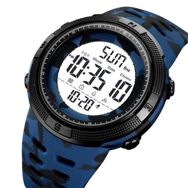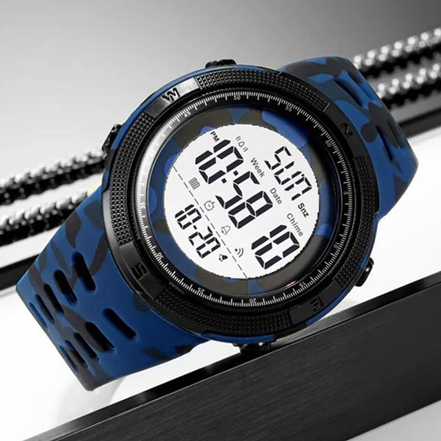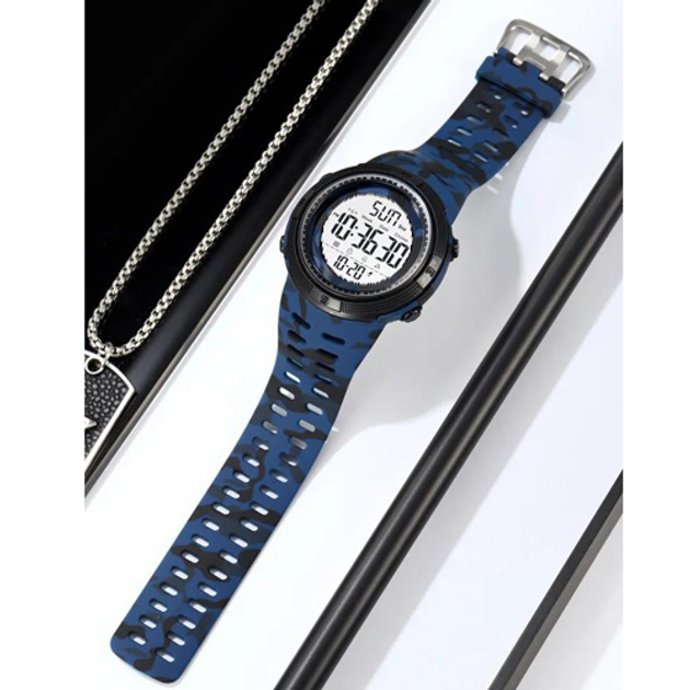 SKMEI 2070CMBUWT — це спортивний електронний годинник, який вирізняється не лише широким функціоналом, а й яскравим зовнішнім виглядом. Камуфляжний ремінець у синьо-чорному кольорі додає динаміки та сміливості, а великий круглий дисплей з чіткими цифрами дозволяє легко зчитувати інформацію навіть на ходу. Модель створена для активного способу життя, спорту та щоденного використання.