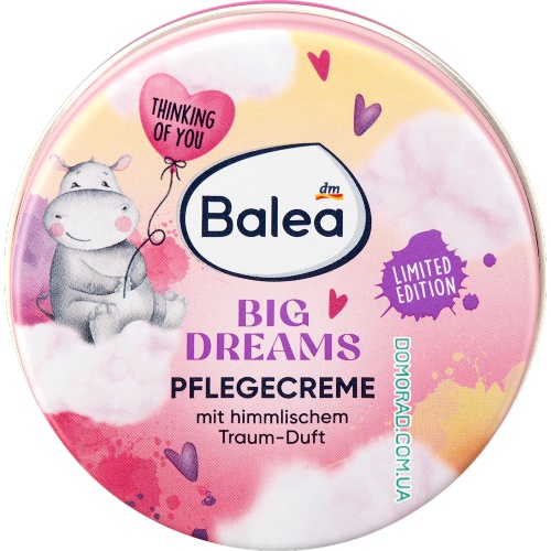 Доглядаючий крем Big Dreams від Balea балує вас ароматом божественної мрії, який зачаровує почуття та забезпечує всебічний приємний догляд. Композиція квітково-фруктового аромату робить нанесення особливим моментом відпочинку. Насичена формула ідеально підходить для інтенсивного догляду та зволоження тіла, обличчя та губ. Цей універсальний крем робить шкіру м’якою та еластичною