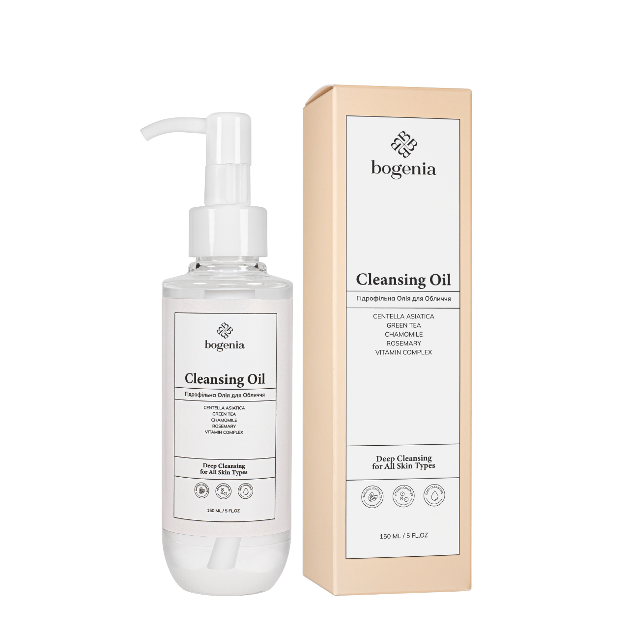 Гідрофільна олія для вмивання Bogenia Cleansing Oil для всіх типів шкіриЦя гідрофільна олія ідеально підходить для видалення з обличчя макіяжу, жиру, забруднень. Засіб м'яко очищає всі типи дерми, не порушуючи природний баланс.У складі — рослинні екстракти ромашки, центели, зеленого чаю, які заспокоюють подразнену шкіру. Гідрофільна олія підходить для всіх типів шкіри — від жирної та проблемної до чутливої.Як користуватися:Нанесіть гідрофільний засіб на сухе обличчя та промасажуйте для демакіяжу, видалення інших забруднень.