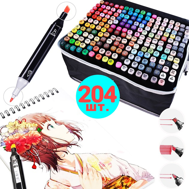 Набір складається з 204 маркерів, кожен із яких відрізняється за кольором. Для зручнішого використання кольору та цифри, що позначають відтінок, нанесені на ковпачки.