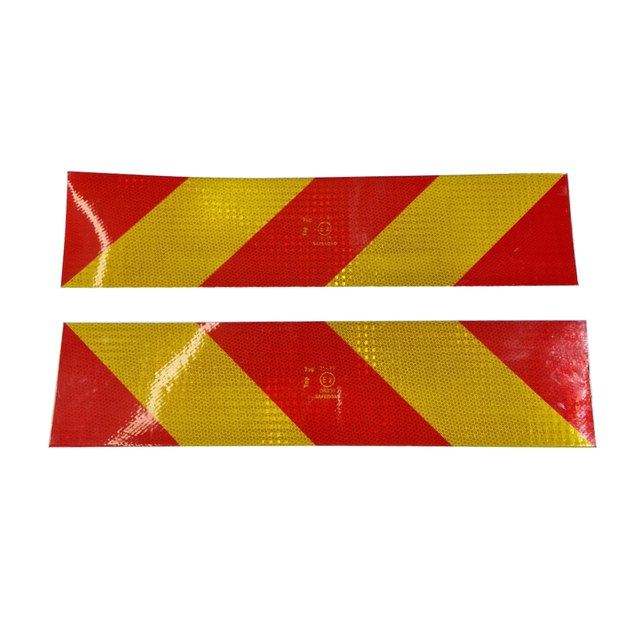 Задні розпізнавальні знаки кріпляться на транспортний засіб великої довжини (причепи та напівпричепи). Знаки виконані у вигляді наклейки з діагональними смугами, що чергуються з жовтого світловідбиваючого і червоного світловідбиваючого матеріалу. Плівка, що використовується для виробництва задніх розпізнавальних знаків, легко подається чищенню, стійка до агресивного середовища. Кріпиться знак на задню частину автотранспортного засобу для покращення видимості у нічний час доби.