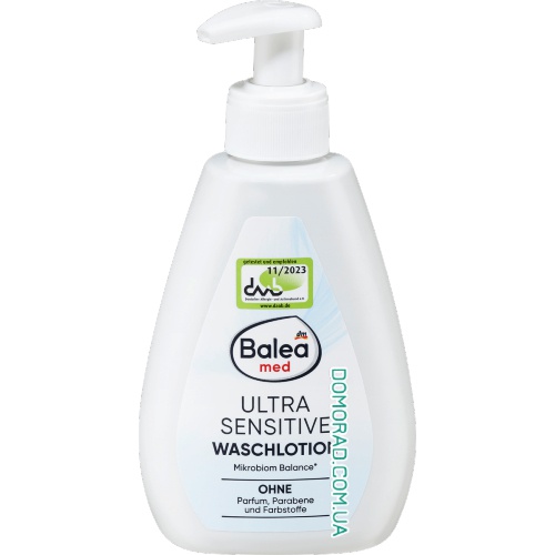 Balea Med Washing Lotion Ultra Sensitive очищає особливо ніжно. Формула догляду з м'яким цукровим ПАР, гліцерином і пантенолом підходить для щоденного очищення дуже чутливої та подразненої шкіри. Підтримує баланс шкірної флори та сприяє збереженню неушкодженого шкірного бар’єру.