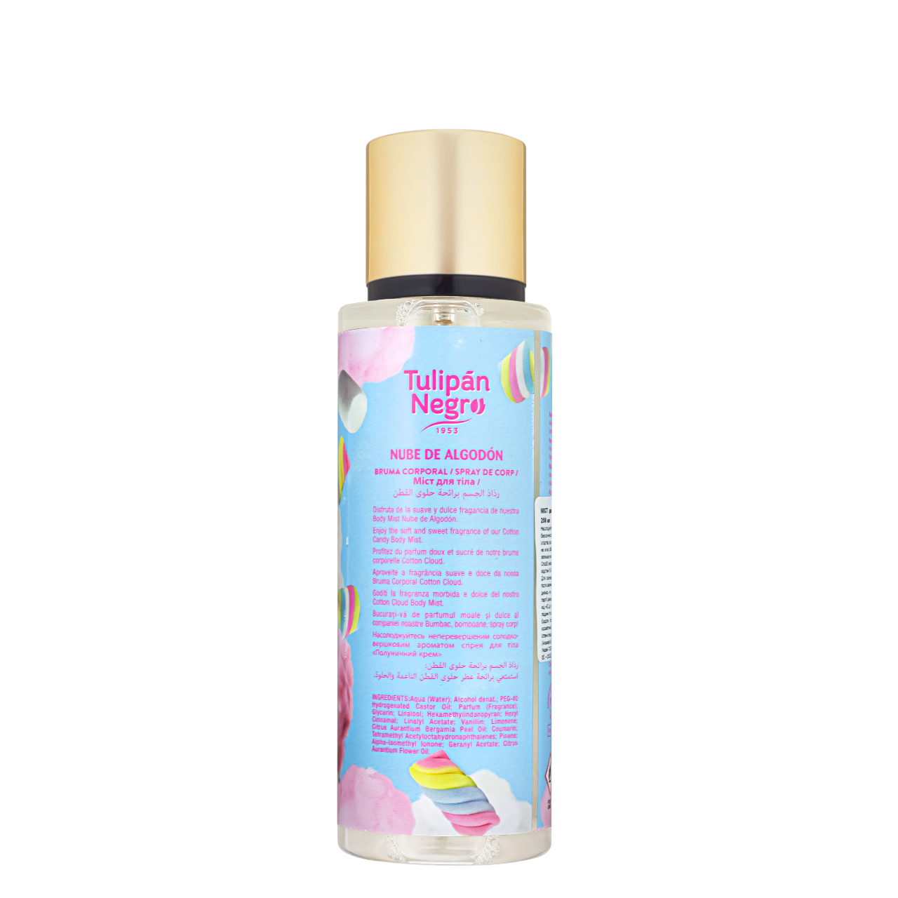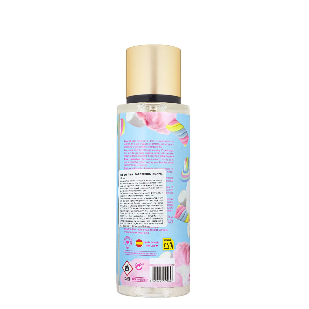 Парфумований спрей-міст для тіла Tulipan Negro "Бавовняна хмара"Пориньте в м'який і солодкий аромат Cotton Cloud Body Mist! Цей боді спрей огортає вас ванільно-цукровим запахом солодкої вати, що схожий на безтурботне дитинство. Міст дарує відчуття свіжості та ніжності, який залишається з вами на весь день.Спрей для тіла ідеально поєднується із запахом лосьйону для тіла та дезодоранту Nube de Algodon від Tulipan Negro.Як користуватися:Розпиліть спрей на тіло після прийняття душу.Об'єм: 250 мл