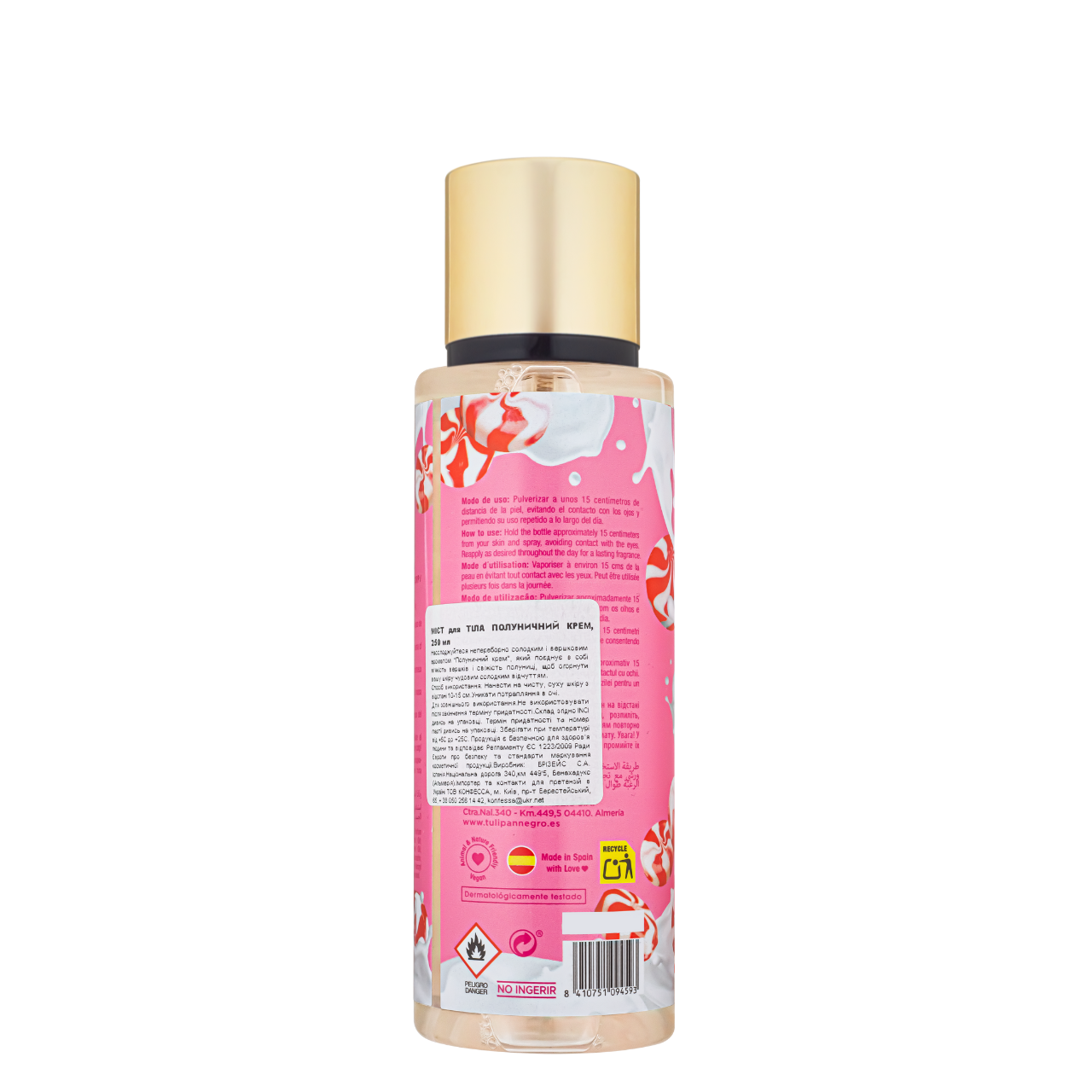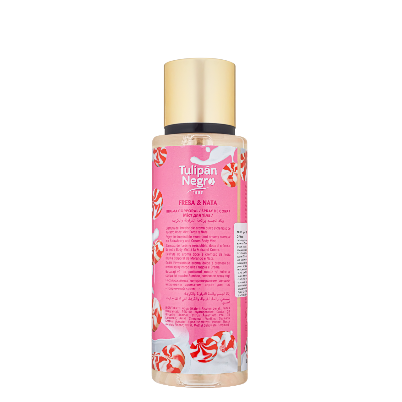Парфумований спрей-міст для тіла Tulipan Negro "Полуничний крем"Пориньте в солодкий і кремовий аромат полуничного крему з Fresa&Nata Body Mist! Цей боді спрей огортає вас ніжним запахом стиглої полуниці, доповненим м'якою кремовою ноткою. Міст дарує відчуття свіжості й ніжності, ароматизуючи шкіру тіла та залишаючи її м'якою і зволоженою на весь день. Спрей для тіла ідеально поєднується з гелем для душу та дезодоранту Fresa&Tata від Tulipan Negro.Як користуватися: Розпиліть спрей на тіло після прийняття душу.Об'єм: 250 мл