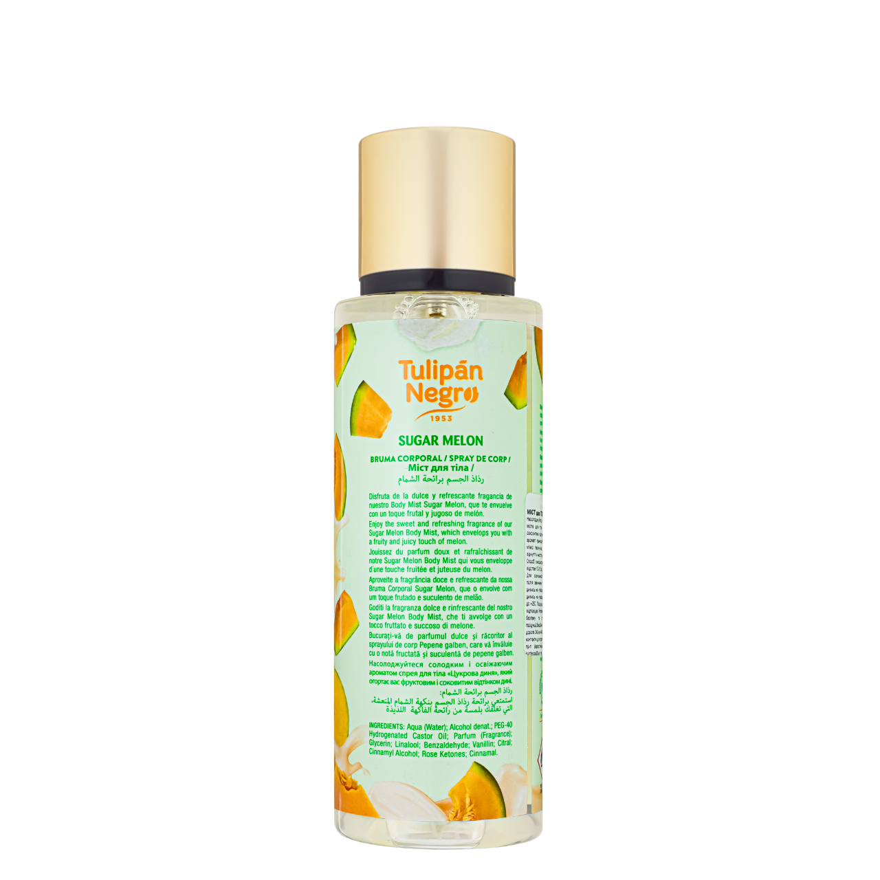 Парфумований спрей-міст для тіла Tulipan Negro Sugar MelonПориньте в свіжий і обволікальний тропічний аромат Sugar Melon Body Mist! Цей парфумований боді спрей огортає вас ніжним ароматом дині, даруючи відчуття чистоти та свіжості впродовж усього дня. Міст не тільки ароматизує шкіру тіла, але й залишає її м'якою та зволоженою.Спрей для тіла ідеально поєднується із запахом гелю для душу та дезодоранту Sugar Melon від Tulipan Negro.Як користуватися: Розпиліть спрей на тіло після прийняття душу.Об'єм: 250 мл