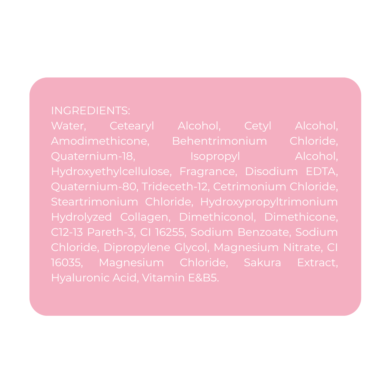 екстракт сакури — насичує волосся антиоксидантами, захищає від негативного впливу довкілля, робить його м'яким і шовковистим.Ефект від застосування зволожувальної маски для волосся:миттєве зволоження та глибоке живлення волосся;