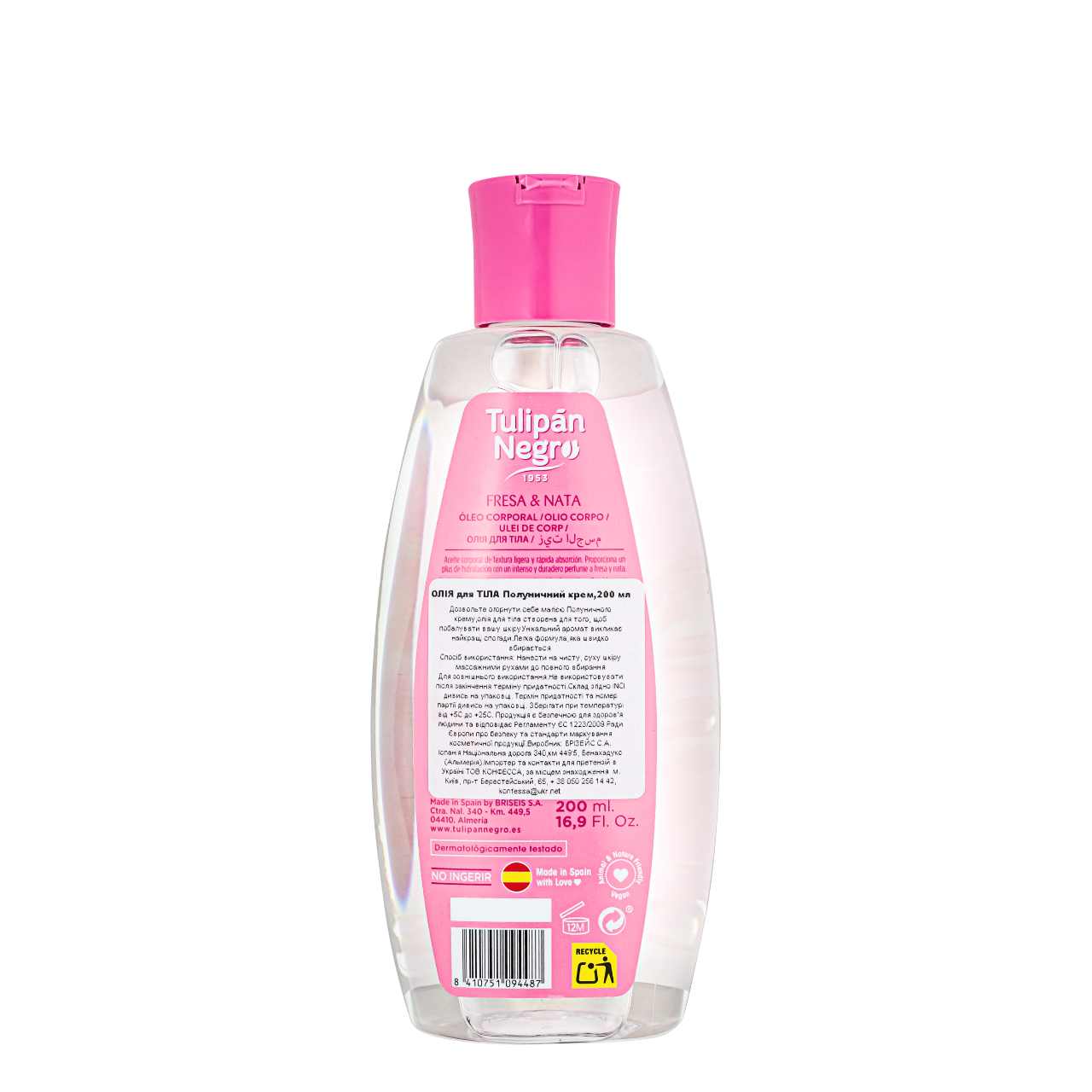 Парфумована олія для тіла Tulipan Negro Fresa & NataНасолоджуйтеся глибоким зволоженням і ніжною турботою з олією для тіла, що огортає шкіру чуттєвим ароматом полуниці та вершків. Його легка формула швидко вбирається, не залишаючи жирного блиску, забезпечуючи тривале зволоження, м'якість і природне сяйво.Олія ідеально підходить для щоденного догляду або розслаблювального масажу. Засіб живить, пом'якшує й робить шкіру шовковистою на дотик. Аромат полуничного крему залишається з вами упродовж усього дня, даруючи відчуття свіжості та релаксу.Ефект від застосування боді олії:інтенсивне зволоження та живлення;