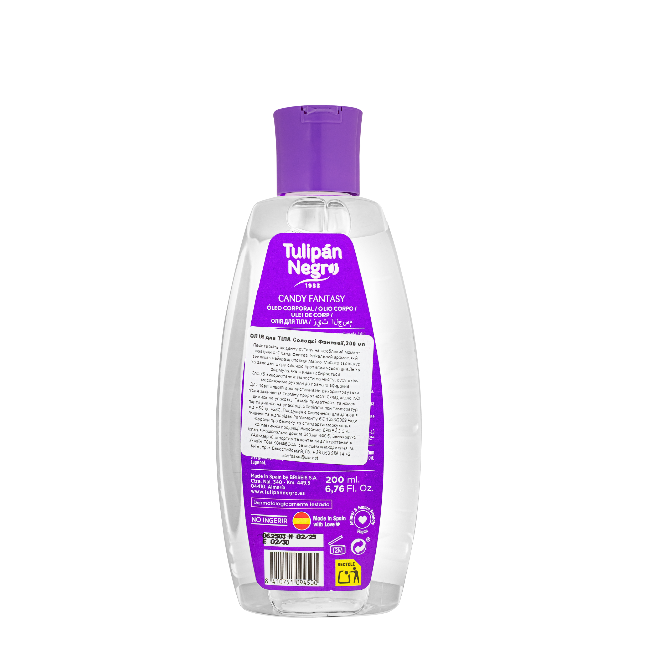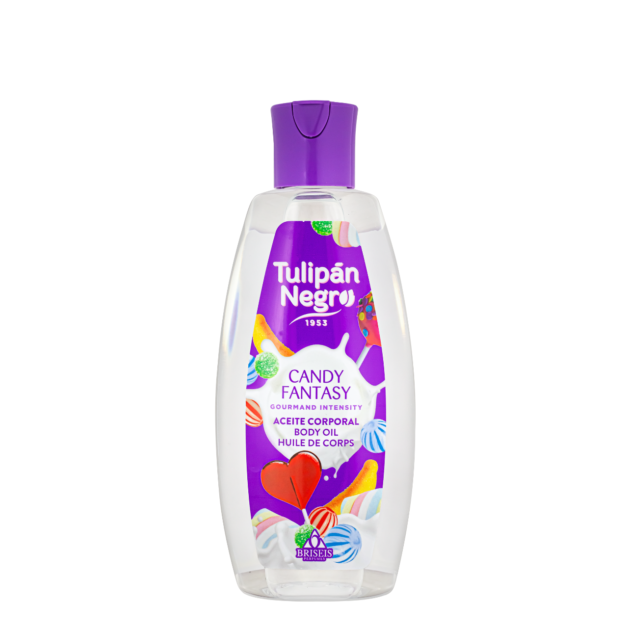 Парфумована олія для тіла Tulipan Negro Candy FantasyНасолоджуйтеся глибоким зволоженням і ніжною турботою з олією для тіла, що огортає шкіру чудовим ароматом солодощів. Його легка формула швидко вбирається, не залишаючи жирного блиску, забезпечуючи тривале зволоження, м'якість і природне сяйво.Олія ідеально підходить для щоденного догляду або розслаблювального масажу. Засіб живить, пом'якшує й робить шкіру шовковистою на дотик. Аромат фруктових льодяників і ванілі залишається з вами упродовж усього дня, даруючи відчуття свіжості та релаксу, занурює в райдужні спогади про дитинство.Ефект від застосування боді олії:інтенсивне зволоження та живлення;