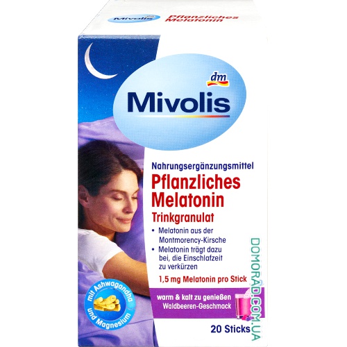 Гранули Mivolis Melatonin Drinking Granules з рослинним мелатоніном з вишні Монморансі містять комбінацію різних рослинних речовин, амінокислоти L-триптофан і магній. Лише 1 мг мелатоніну допомагає скоротити час, необхідний для засинання. Магній також сприяє нормальній роботі нервової системи. Мелатонін, який також називають «гормоном сну», — це речовина, яка виробляється організмом переважно вночі та потрапляє в кров. Денне світло, навпаки, пригнічує вироблення мелатоніну. Цей ритм може порушуватися різними впливами і гальмувати фазу засинання.