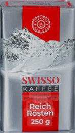 Кава мелена Swisso Reich Rosten — якісна, натуральна, ароматна, збалансована, складається виключно з зерен арабіки. Зерна середнього ступеня просмаження набувають смаку з легкою гіркуватістю, шоколадною ноткою, насиченою міцністю та стійким солодким післясмаком. Середній помел дає змогу використовувати цю каву для приготування різними способами як у кавомашині, так і в чашці.