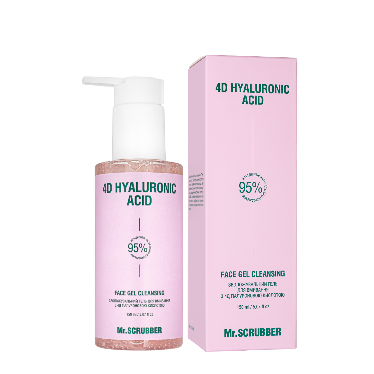 Зволожувальний гель для вмивання Mr. Scrubber 4D Hyaluronic Acid з гіалуроновою кислотою, AHA кислотами, пептидамиГель для вмивання на основі гіалуронової кислоти ретельно, але водночас делікатно видаляє зі шкіри обличчя всі типи забруднень, включно з макіяжем. Очисний засіб не викликає подразнення або сухості, зберігає обличчя свіжим і доглянутим.Як працює гіалуроновий гель для вмивання:4D гіалуронова кислота — формує на поверхні епідермісу тривимірну сітку для збереження вологи;