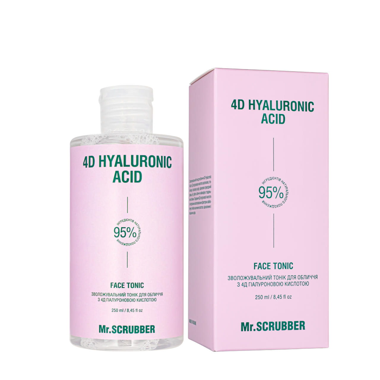 Зволожувальний тонік для обличчя Mr. Scrubber 4D Hyaluronic Acid з 4D гіалуроновою кислотою, гідролатом троянди, пептидамиГіалуроновий тонік заспокоює, пом'якшує і зволожує зневоднену шкіру, робить її гладкою й освіжає тон обличчя, відновлює природний рівень pH. Поєднання комплексу гіалуронової кислоти з 4 видами молекул і натурального зволожувального фактора забезпечує глибоке насичення вологою, відновлення й зміцнення шкіри.Як працюють активні компоненти зволожувального тоніка:4Д гіалуронова кислота — формує тривимірну сітку на поверхні дерми для збереження вологи, запобігає її втраті, відновлює і зміцнює природний бар'єр, захищає шкірний покрив від дії довкілля;