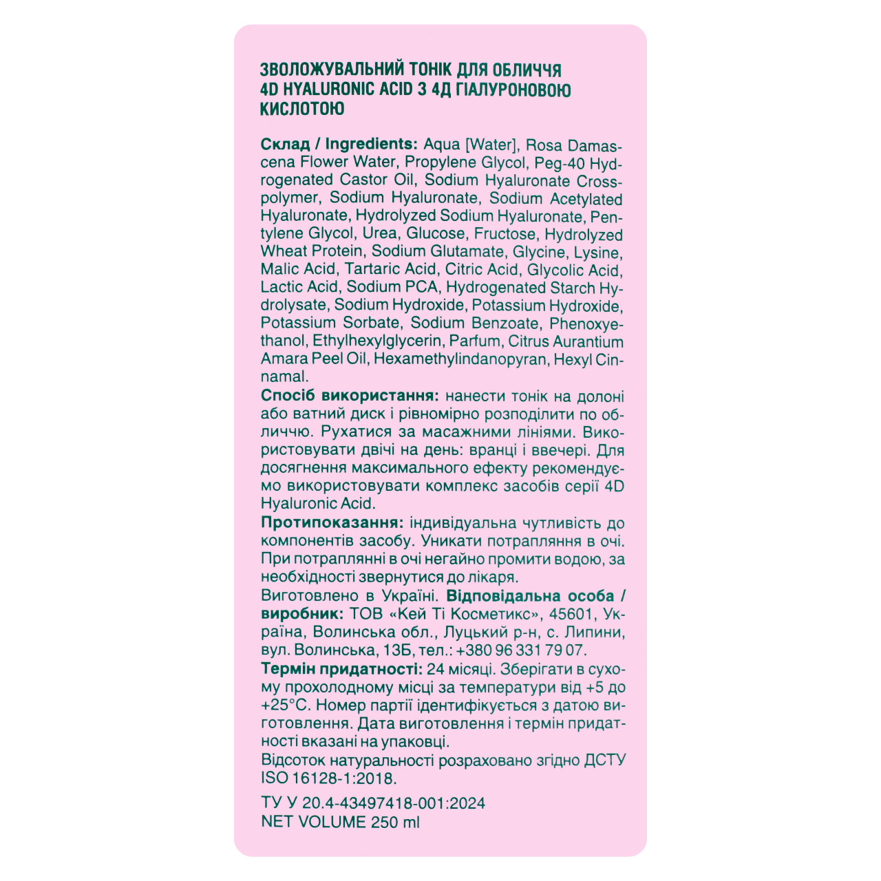 Для підтримки рівня зволоження наносьте тонік вранці та ввечері.Для досягнення максимального ефекту рекомендується використовувати комплекс засобів серії 4D Hyaluronic Acid.Об'єм: 250 мл