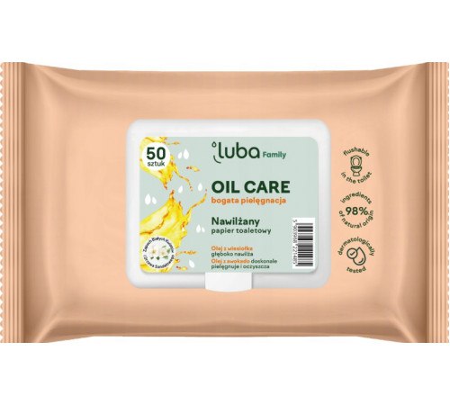 Luba Family OIL CARE: зволожений туалетний папір на основі унікальних олій для комплексної гігієни та догляду за шкірою. Олія авокадо має поживні та очищувальні властивості. Олія примули вечірньої зі зволожувальними властивостями. Бавовняна олія з поживними та відновлювальними властивостями. Засіб пройшов дерматологічні випробування, має фізіологічний pH, що підходить навіть для найчутливішої шкіри. Паперовий матеріал на 100% натуральний, біорозкладний, його можна змивати в унітаз. Продукт призначений для всіх типів шкіри.