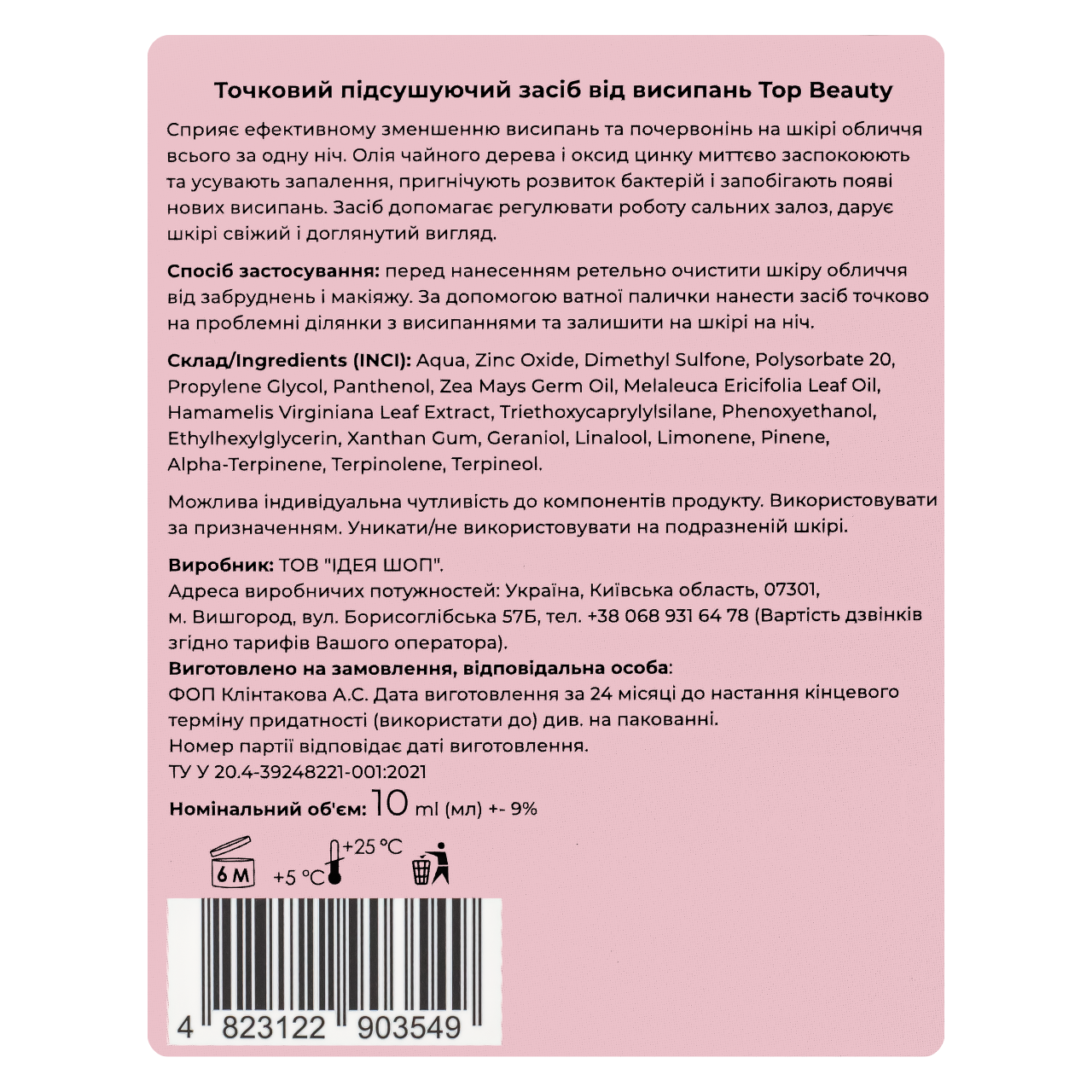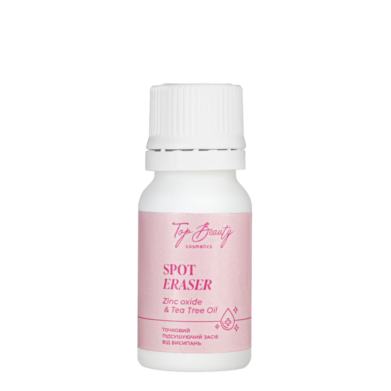 Точковий підсушувальний засіб від висипань Top Beauty Spot Eraser з олією чайного дерева й оксидом цинкуЛокальний засіб від Top Beauty — твій вірний помічник у боротьбі з прищами, акне, вуграми. Емульсія сприяє ефективному зменшенню висипок і почервоніння на шкірі обличчя лише за одну ніч. Засіб допомагає регулювати роботу сальних залоз, дарує жирний, проблемний, схильний до недосконалостей шкірі свіжий і доглянутий вигляд.Як працюють активні компоненти точкового засобу для усунення прищів:олія чайного дерева — зменшує запалення й пригнічує бактерії, що викликають акне; оксид цинку — підсушує прищі та прискорює загоєння шкіри.Спосіб застосування:Ретельно очистьте шкіру обличчя від забруднень і макіяжу. Ватною паличкою нанесіть засіб точково на проблемні зони з висипками та залиште на шкірі на ніч.Об'єм: 10 мл
