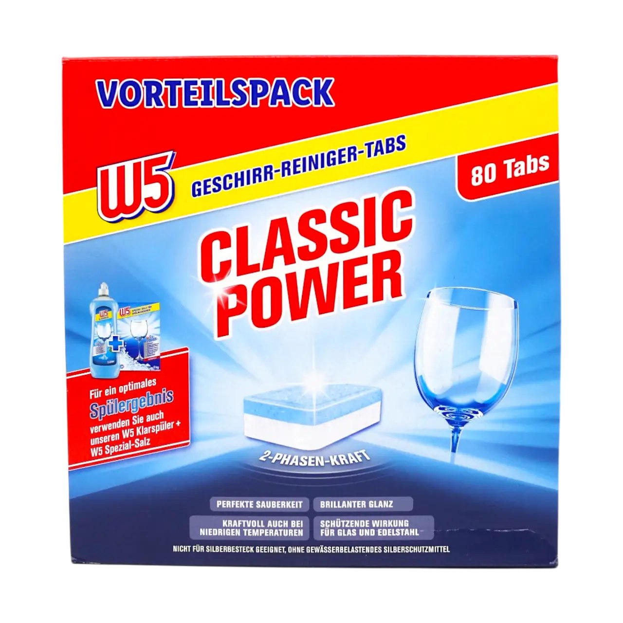 Безфосфатний миючий засіб у таблетках W5 Classic для застосування в посудомийних машинах чудово справляється зі своїми обов'язками. Посуд, вимитий за допомогою цих таблеток, отримує чистоту та блиск. Таблетки виготовлені за формулою, яка при попаданні таблеток у воду виділяє з них знежирюючий засіб, який видаляє жири та залишки їжі з посуду. Таблетки W5 прибирають накип у посудомийній машині, що продовжує термін її роботи. Універсальні таблетки для миття посуду в посудомийній машині з потужною дією ефективно видаляють навіть стійкі забруднення, зберігаючи при цьому малюнок та декоративні частини посуду. Вони підходять для миття столових приладів (ложок, ножів, виделок), тарілок, каструль і навіть чайника! Пігулки W5 Classic відносяться до розряду миючих засобів, що не містять у своєму складі шкідливих речовин.