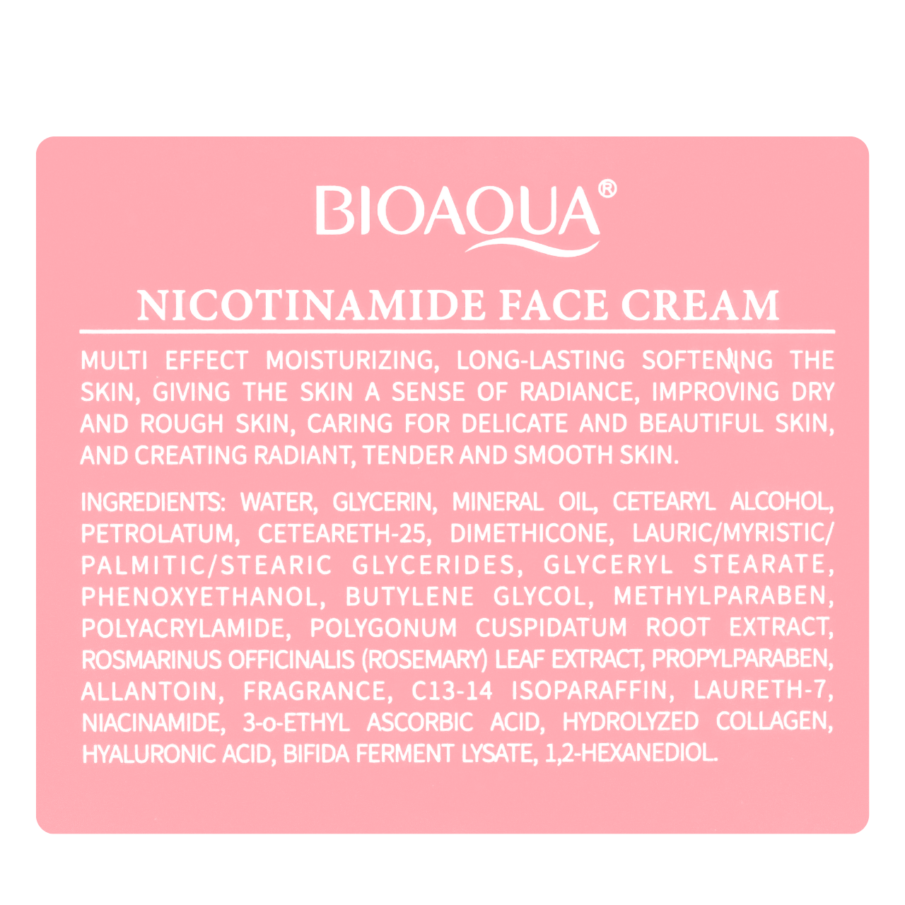 Bioaqua Nicotinamide Cream — зволожувальний мультиефективний крем для обличчя з нікотинамідом і вітаміном СКрем для обличчя з ніацинамідом, вітаміном C і гіалуроновою кислотою подарує вашій шкірі зволоження, вирівнювання тону, зробить її сяйливою та гладкою. Багатофункціональний засіб розроблений для комплексного догляду за шкірою, що потребує відновлення, зволоження та вирівнювання тону.Завдяки збалансованій формулі з активними компонентами, крем делікатно усуває сухість і лущення, надає шкірі м'якість, гладкість і здорове сяйво, прибирає пігментацію та вирівнює тон.Як працюють активні компоненти:екстракт розмарину — тонізує шкіру, освіжає й допомагає боротися із запаленнями;