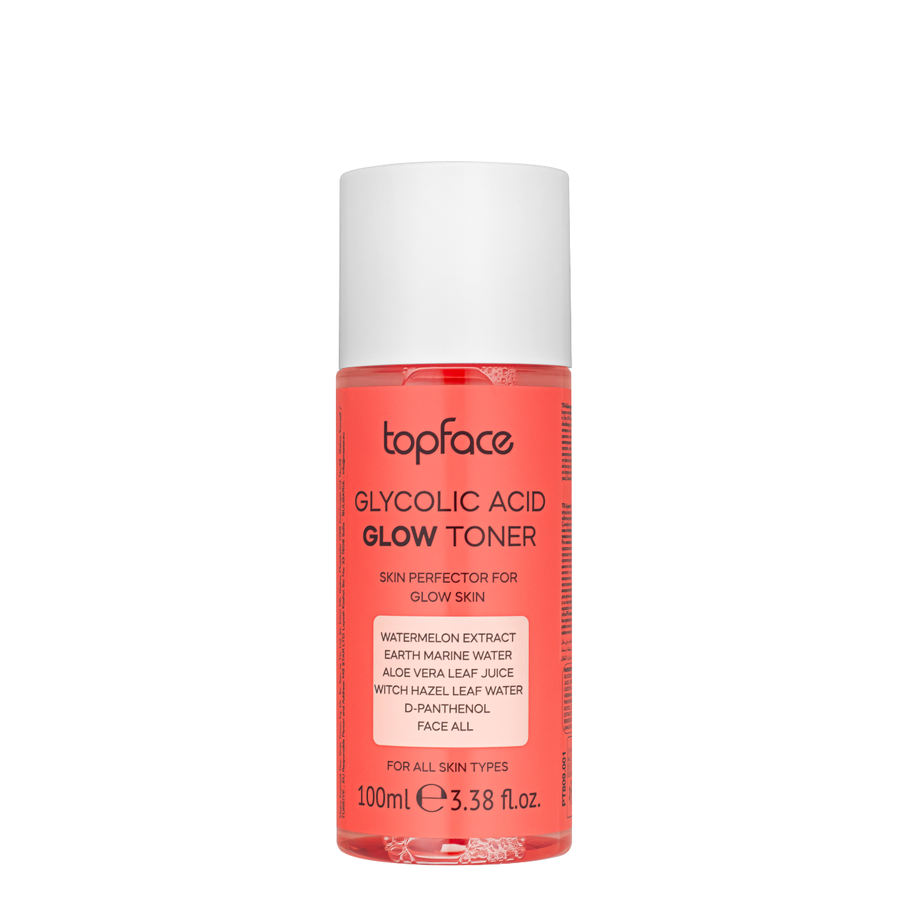 Тонік для обличчя з гліколевою кислотою topface Glycolic Acid Glow Toner "Сяйво та свіжість шкіри"Цей ефективний тонік із гліколевою кислотою створений для м'якого очищення, відновлення балансу та надання здорового сяйва шкірі. Формула із соком алое вера, морською водою й пантенолом делікатно усуває жирний блиск, звужує пори, заспокоює шкіру та покращує колір обличчя.Цей ніжний кислотний тонік підходить для всіх типів шкіри та пройшов дерматологічні дослідження. Інші переваги продукту:прекрасно видаляє надлишки жиру та забруднення; забезпечує свіжість і сяйво шкіри; сприяє звуженню пор шкіри; балансує й заспокоює подразнений епідерміс; надає обличчю рівномірнішого та здоровішого відтінку.Як працюють активні компоненти кислотного тоніка:гліколева AHA кислота — м'яко відлущує змертвілі клітини, стимулює оновлення шкіри та надає їй гладкість і сяйво; екстракт кавуна — зволожує й освіжає шкірний покрив; морська вода — насичує клітини мінералами та тонізує; сік алое вера — заспокоює, зволожує та знімає запалення; екстракт гамамелісу — зменшує почервоніння, вирівнює тон обличчя; пантенол — живить і підтримує природний бар'єр шкіри.Як користуватися:Нанесіть тонік на ватний диск і протріть чисту шкіру обличчя, уникаючи зони навколо очей. Використовуйте вранці та ввечері перед нанесенням сироватки або крему.Об'єм: 100 мл