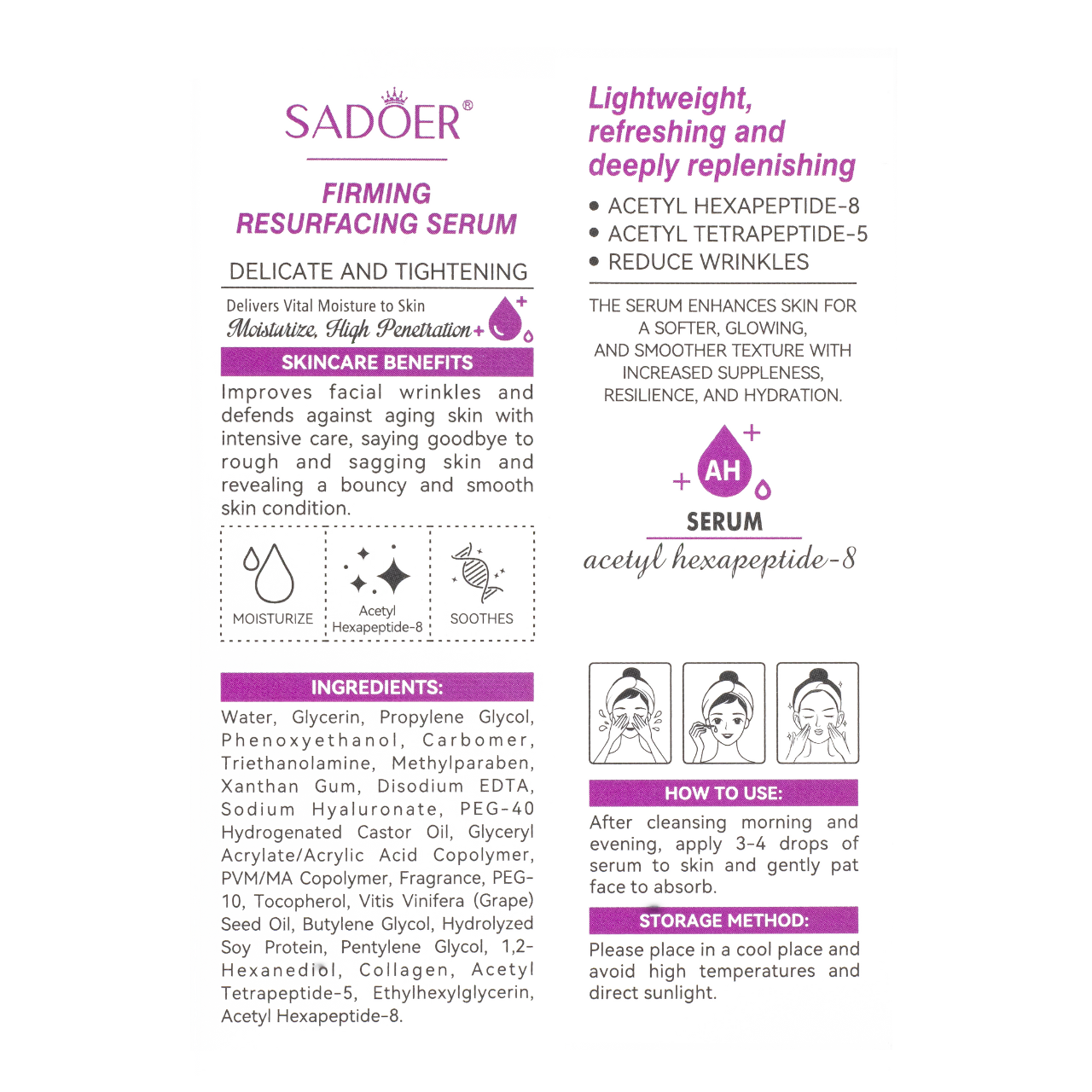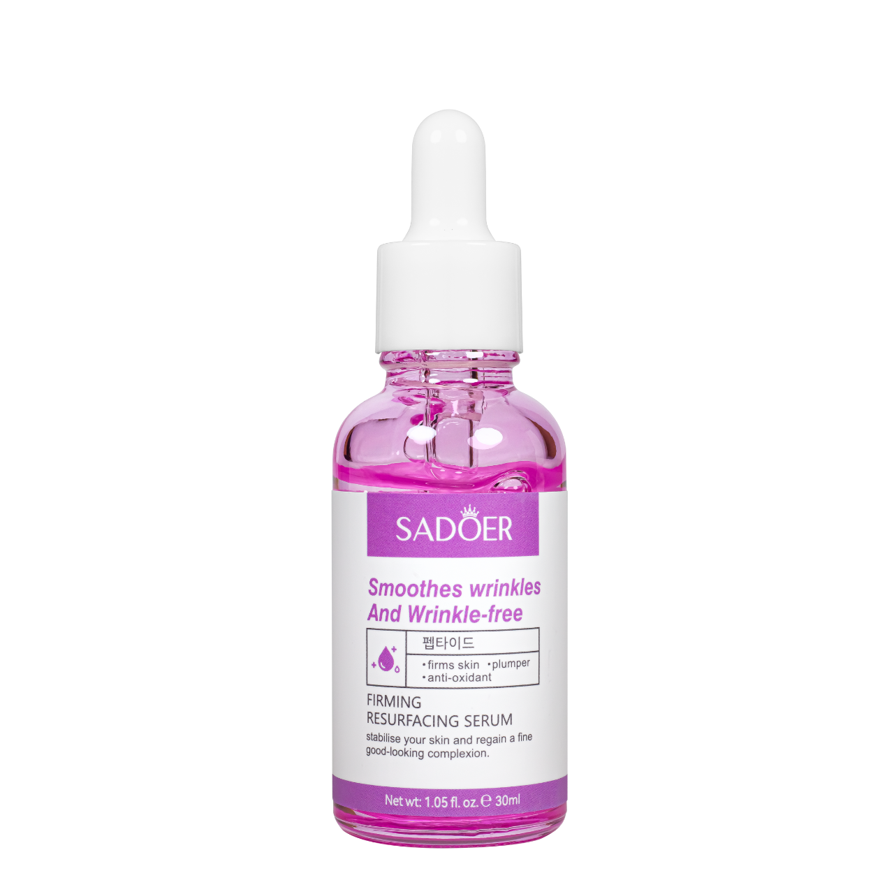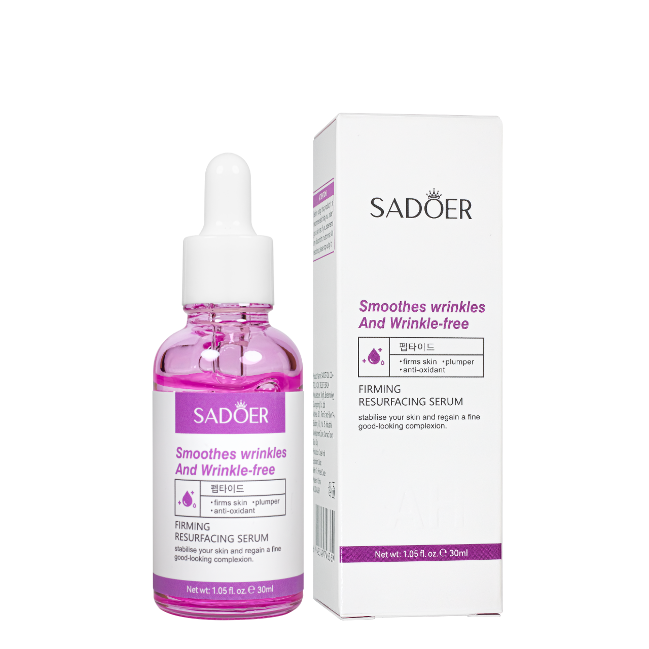 Сироватка Sadoer Firming Resurfacing Serum проти зморщок і для омолодження шкіри обличчя, з пептидами 30 млІнтенсивна омолоджувальна сироватка для обличчя, розроблена для вирівнювання текстури вікової шкіри, боротьби зі зморшками та глибокого зволоження. Легка текстура серуму швидко вбирається, не залишає липкості й ідеально підходить для багатоступеневого антиейдж догляду.Сироватка містить пептиди — високоефективні молекули, які стимулюють вироблення колагену та сприяють відновленню шкірного бар'єра. Пептиди допомагають зміцнити структуру шкіри, зменшити виразність зморщок, поліпшити еластичність і прискорити процеси регенерації.Регулярне застосування сироватки з пептидами робить шкіру щільнішою, гладкішою та молодшою на вигляд.Ключові властивості антивікової сироватки від Sadoer:згладжує епідерміс — активні компоненти (включно з пептидами й антиоксидантами) стимулюють оновлення клітин і зменшують виразність зморщок;