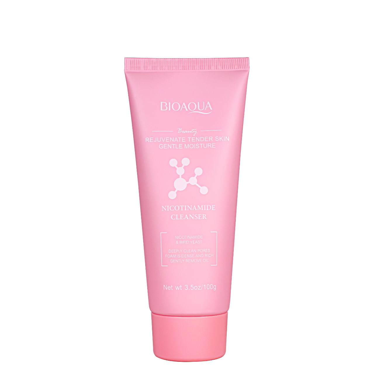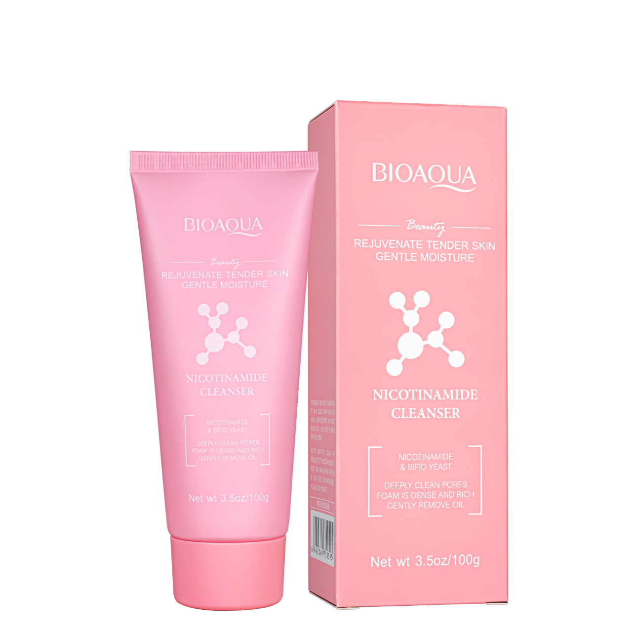 Пінка для вмивання Bioaqua Nicotinamide Face Cleanser з ніацинамідом і пробіотиками — м'яке очищення і зволоження шкіриДелікатний та ефективний засіб для вмивання з ніацинамідом і лізатом біфідобактерій створений для глибокого очищення пор і відновлення балансу шкіри. Щільна, насичена піна легко видаляє надлишки себуму, забруднення та залишки макіяжу, не пересушуючи епідерміс.Як працюють активні компоненти:ніацинамід (вітамін B3) — вирівнює тон шкіри, звужує пори, надає шкірі свіжий і сяйний вигляд;