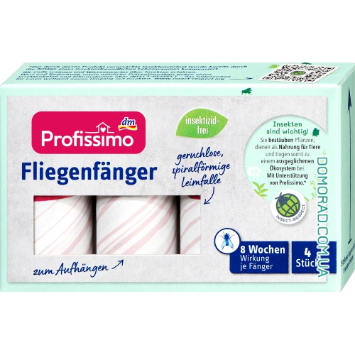 Клейова мухоловка Profissimo виготовлена ​​з натуральних продуктів. Нетоксична мухоловка має дуже високий ефект уловлювання завдяки перевіреним властивостям клею та своїй типовій формі. Крім того, кожна мухоловка служить 8 тижнів.