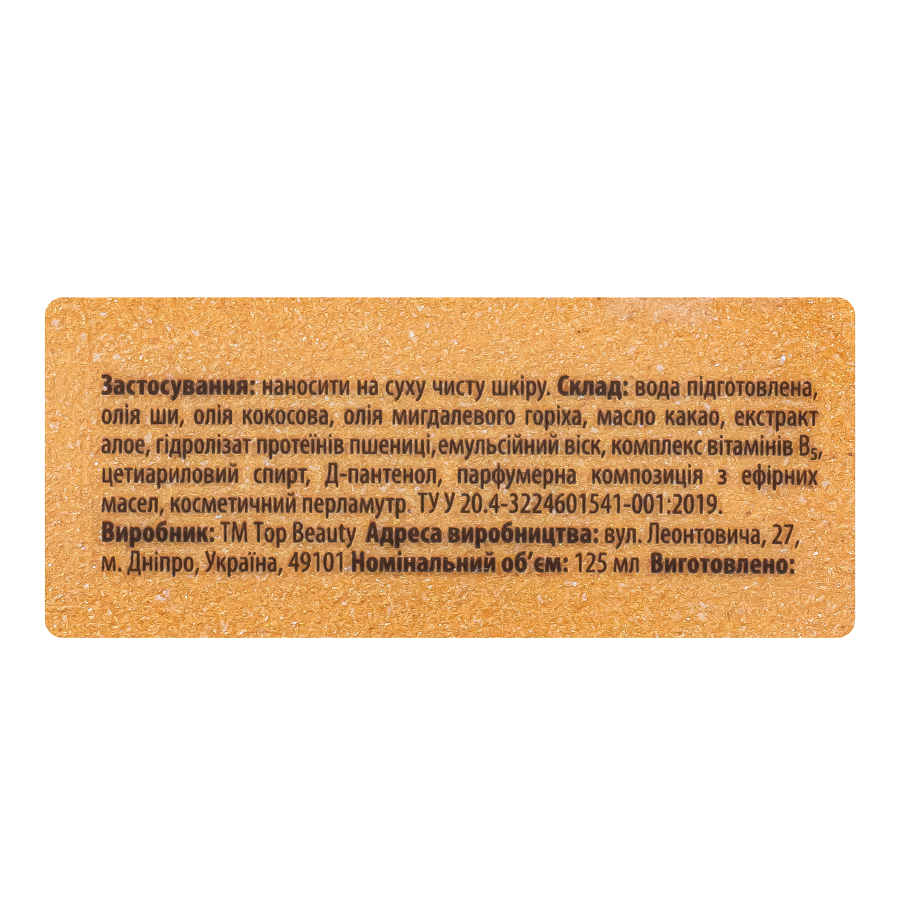 Молочко для тіла із шимером Top Beauty Body Shimmer з олією ши, кокоса, какао,Боді-шимер Top Beauty додасть вашій шкірі спокусливого сяйва, що підкреслить вашу засмагу, залишає на тілі приголомшливий аромат, що огортає шкіру на довгий час.Цей ніжний крем-шимер для тіла інтенсивно зволожує, живить і пом'якшує завдяки комплексу натуральних олій: мигдалю, ши, какао, кокоса, а також протеїнам пшениці та Д-пантенолу. Засіб робить шкіру гладкою, еластичною й надає їй делікатного сяйва.Шимер для тіла доступний у трьох відтінках:перловий — для дуже світлої шкіри; золотий — для злегка засмаглої; бронзовий — для виразної засмаги.Як використовувати: Нанесіть крем на суху шкіру тіла після душу.Об'єм: 125 мл