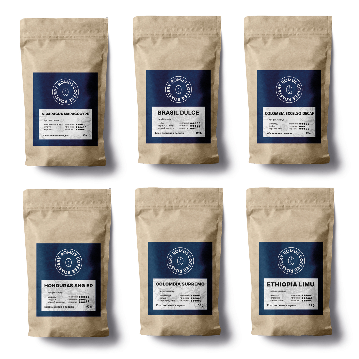 Дегустаційний набір зернової кави «Преміум» — 6 смаків по 50 г від Romus Coffee Roastery