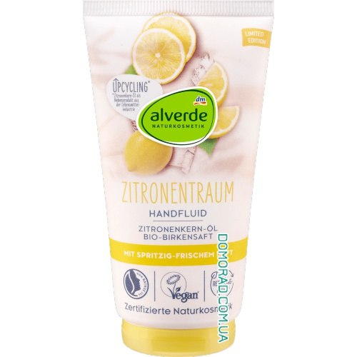 Флюїд для рук «Лимонова мрія» від alverde NATURKOSMETIK балує ваші руки завдяки спеціальній формулі догляду. Олія лимонних кісточок, отримана з лимонних кісточок, та органічний березовий сік забезпечують інтенсивне зволоження та догляд за шкірою. Освіжаючий лимонний аромат бадьорить почуття та забезпечує приємний догляд. Сертифікований як натуральний продукт, він не містить мінеральних олій, виключно синтетичних ароматизаторів та барвників, а також консервантів. Ідеально підходить для щоденного використання та відчуття гладкої шкіри.