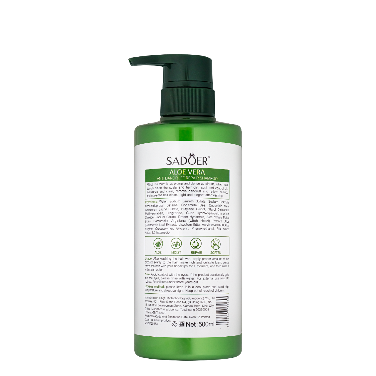 Відновлювальний шампунь проти лупи Sadoer AloeVera Anti-Dandruff Repair ShampooШампунь поєднує очищення від лупи з турботою про волосся. Засіб не тільки видаляє лущення, повертаючи вам комфорт, але й зволожує та відновлює локони. Завдяки багатій пені та ніжній формулі, волосся відчувається більш чистим, м'яким, здоровим уже після одного миття.Активна дія:глибоке очищення шкіри голови;