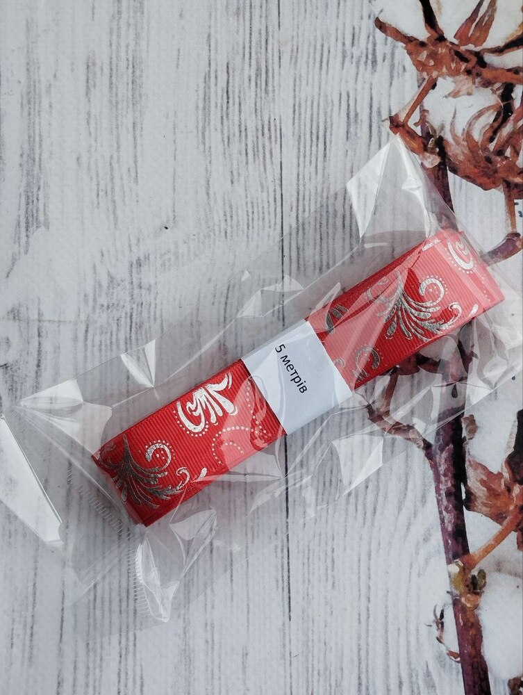 Стрічка декоративна репс 2,5 см Візерунок червона+срібло 5 м.