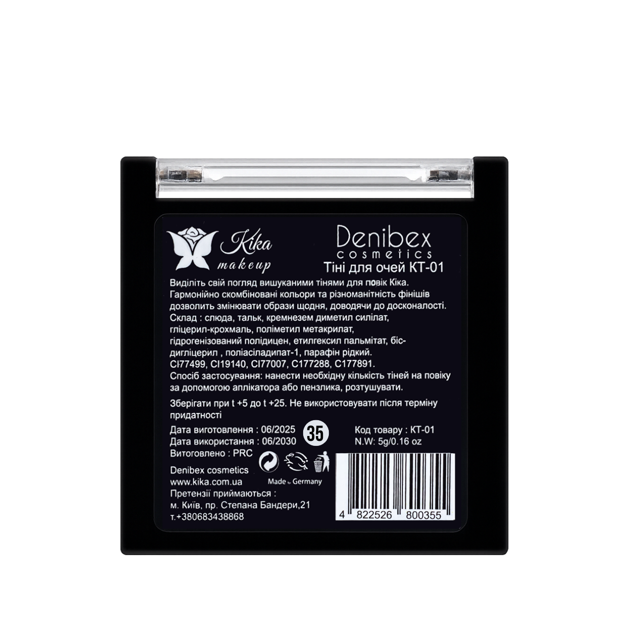 Одинарні тіні для макіяжу повік Kika KT-01Шимерні та матові відтінки тіней для повік Kika допоможуть вам створити унікальні образи для будь-якого випадку. Ви зможете підкреслити красу очей і у денному, і у вечірньому образі. Тіні мають відмінну пігментацію і високу стійкість. Вони добре розтушовуються, не скочуються і не обсипаються протягом дня. Блискучі та матові текстури в колекції тіней для очей Kika допоможуть вам створювати унікальні та оригінальні луки.З монотіней ви зможете зібрати свою ідеальну палетку, в якій кожен відтінок ідеально вам підходить. До тіней додається зручний аплікатор. У футлярі є маленьке дзеркальце, яке допоможе вам підправити макіяж очей у будь-який час.Спосіб застосування: використовуйте тіні для макіяжу очей, а також як підводка.
