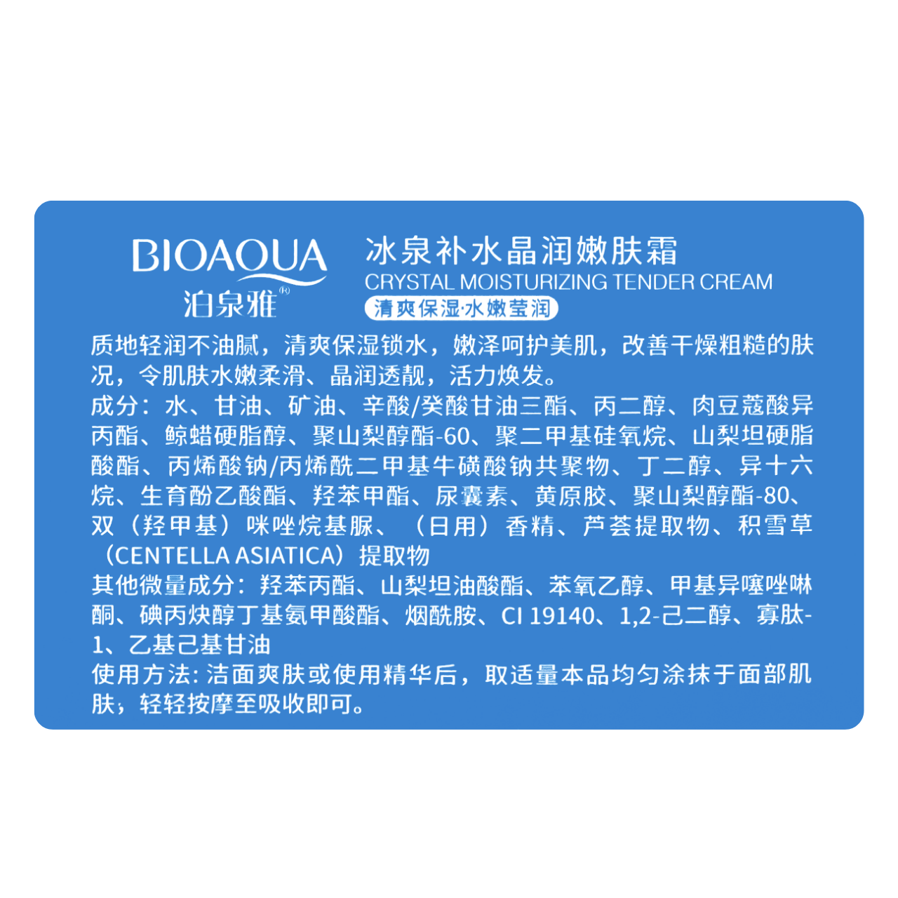 Охолоджувальний зволожувальний крем для обличчя Bioaqua HO Crystal Ice Spring з ментолом та гіалуроновою кислотоюСвіжість, зволоження та зменшення набряків забезпечить крем для обличчя Bioaqua HO Crystal Ice Spring. Цей легкий крем для обличчя з ментолом створений для інтенсивного зволоження, тонізації та зняття слідів втоми з обличчя. Ідеальний для літнього сезону, спекотної погоди та догляду після сонця, а також зняття слідів втоми після вечірки. Підходить для всіх типів шкіри, включно з жирною та комбінованою.Гіалуронова кислота зволожить дерму, допоможе згладити дрібні зморшки та повернути обличчю сяйво. Крем швидко вбирається, не залишає жирного блиску та миттєво дарує відчуття прохолоди та комфорту, особливо приємного вранці або після активного дня.Ключові компоненти та їх дія:гіалуронова кислота — наповнює шкіру вологою, зберігає її пружність і м'якість;