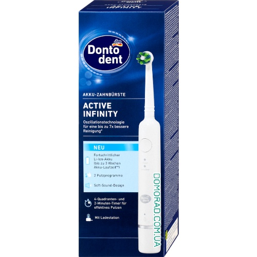 З бездротовою зубною щіткою Dontodent Active Infinity щоденний догляд за ротовою порожниною стає комфортним. Ця електрична зубна щітка пропонує дві практичні програми чищення, включаючи чутливий режим для чутливих ясен. Оснащена 2-хвилинним таймером і 4-квадрантним таймером, вона забезпечує рівномірне та ефективне очищення всіх ділянок щелепи. Завдяки тривалому часу роботи від батареї до трьох тижнів, вона ідеально підходить для щоденного використання та подорожей. У поєднанні з насадкою-щіткою Dontodent Active Cross вона видаляє до семи разів більше зубного нальоту, ніж звичайна ручна зубна щітка.