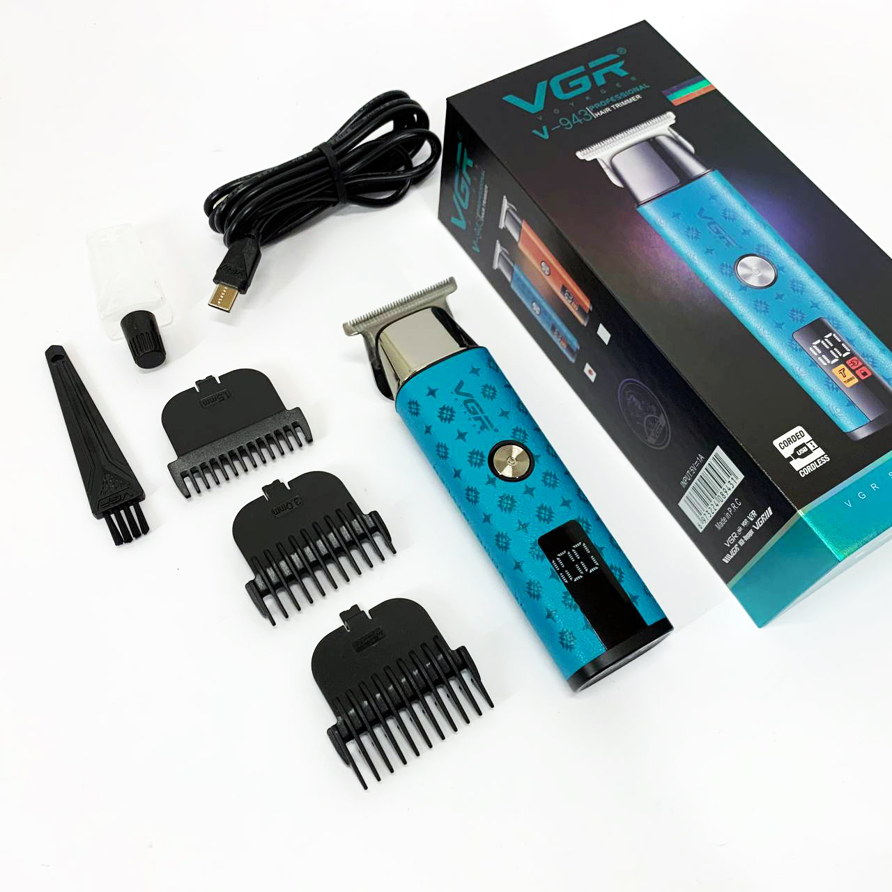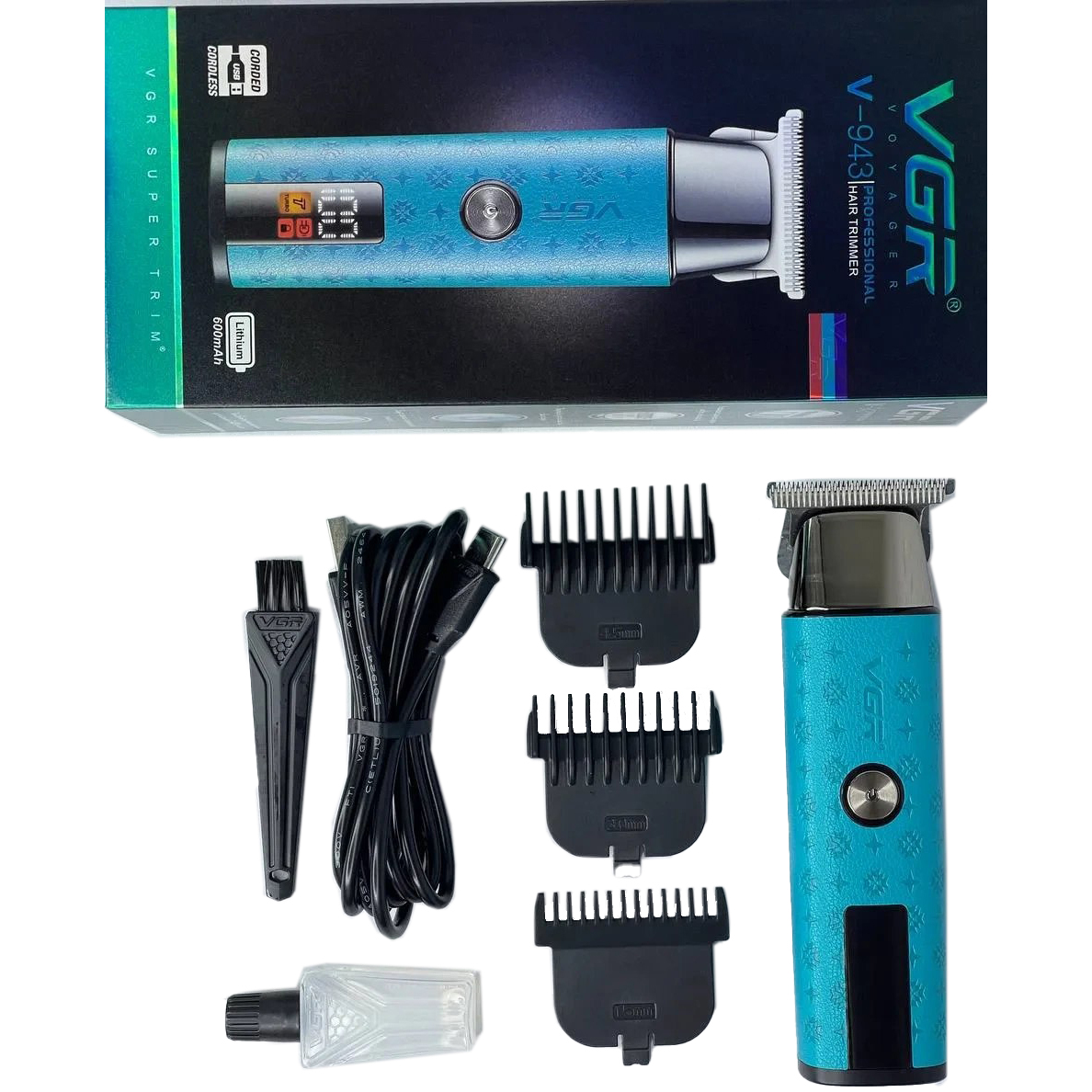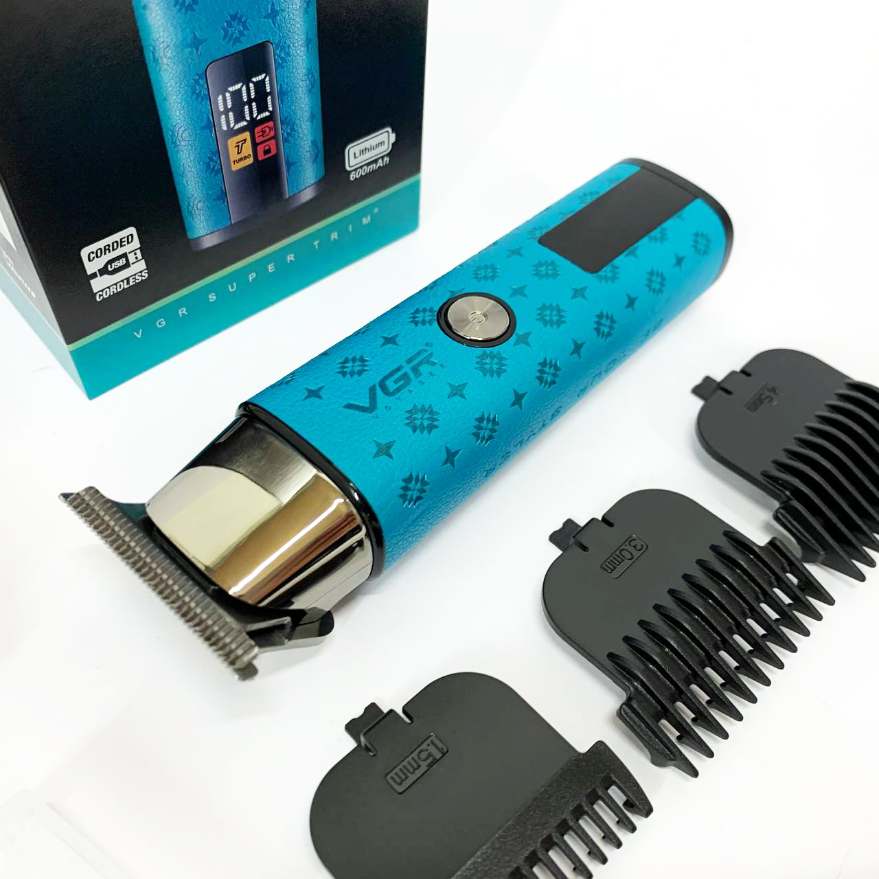 У комплект входять 3 змінні насадки, що дозволяють регулювати довжину зрізу та підлаштувати триммер під різні зони догляду, від щетини до акуратного окантування. Інтуїтивний LED-дисплей відображає рівень заряду та поточний режим роботи, забезпечуючи зручність та контроль у процесі використання. VGR V‑943 BLUE— це стильне, просте та функціональне рішення для тих, хто цінує якість та зручність у догляді за собою.