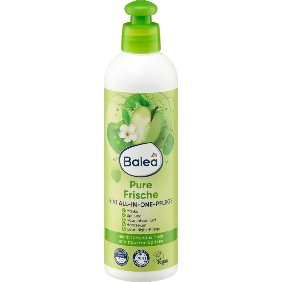 All-In-One Care Pure Freshness від Balea поєднує кілька функцій в одному продукті і тому є ідеальним рішенням для вимогливого волосся. Ця сироватка забезпечує інтенсивний догляд за волоссям і забезпечує гладкість кінчиків. Завдяки освіжаючому аромату зеленого яблука він не тільки насолоджує почуття, але й захищає волосся від пошкодження температурою до 220 градусів. Ідеально підходить для злегка жирного волосся та сухих кінчиків, засіб можна використовувати як маску, кондиціонер або догляд на ніч.