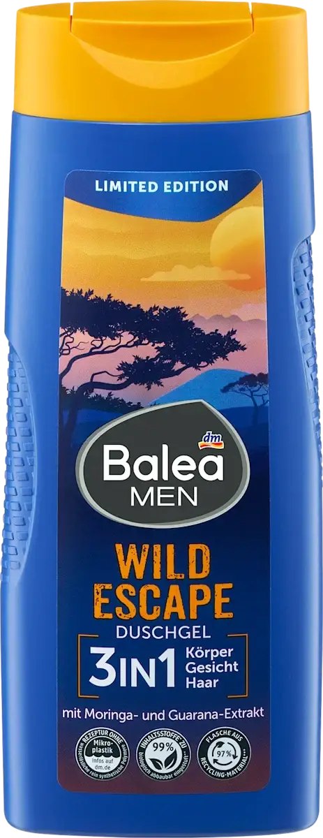Гель для душу Balea Men's Wild Escape пропонує освіжаюче очищення шкіри та волосся. Завдяки своєму бадьорому аромату та чоловічій нотці він забезпечує інтенсивне освіження. Ніжна формула ретельно очищає, не висушуючи шкіру, та має нейтральний pH. Ідеально підходить для щоденного догляду та відчуття енергії та пригод. Тут ідеально поєднуються догляд та аромат.