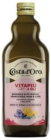 Суміш мастил Costa d'Oro Vitapiu Omega виготовлена італійським виробником за допомогою холодного пресування, що зберігає всю користь продукту. Його основу становлять чотири рослинні олії, зроблені з насіння таких культур як кукурудза, виноград, соняшник та льон.