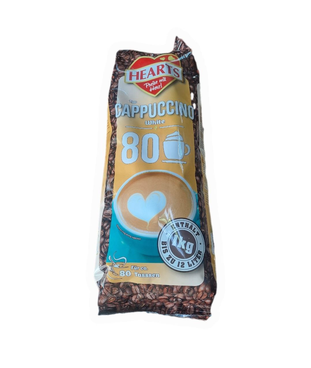 HEARTS капучино білий в італійському стилі поєднує розчинну каву з молоком. Результатом цієї комбінації є чудовий італійський капучино з молочним смаком, покритий красивою піною з чудовим ароматом, смаком і запахом. Продукт ідеально підходить для приємного проведення часу вдома, а також як доповнення до зустрічей на роботі та в справах. 1 кг капучино вистачає на 80 чашок! Пропорція: Покладіть в кружку 3 чайні ложки капучіно (12,5 г). Додати гарячу, але не киплячу воду (150 мл), перемішати. Готовий до вживання!