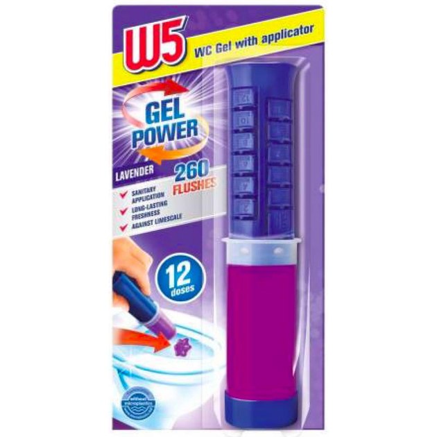Туалетний освіжувач для унітазу з аплікатором W5 Лаванда у гелевій формі. Він не тільки очищає унітаз, але й запобігає утворенню накипу, забезпечуючи свіжість та чистоту. Один гелевий диск забезпечує ефективну дію близько 1 тижня. Найкращі результати досягаються, коли гелевий диск застосовується у місці найбільшого потоку води. Застосування поза основним потоком води може збільшити тривалість використання, але знизить ефективність. Спосіб застосування: спочатку зніміть ковпачок. Зверніть увагу на кнопку "СТАРТ", яка блокує введення синього поршня в циліндр, де міститься гель. Натиснувши кнопку "СТАРТ" усередині синього плунжера, ви розблокуєте замок. Прикладіть три опори до сухої частини корпусу та повільно натисніть на синій поршень. Коли наступна кнопка торкнеться краю валика з гелем, її буде заблоковано, і ви відчуєте легкий опір. Коли потрібно використати ще один гелевий диск, натисніть кнопку з найменшим номером і повторіть вищезгадані кроки, починаючи з пункту 2. Не забудьте закрити шприц і надійно закрити його після кожного використання.