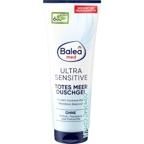 Гель для душу Balea med Ultra Sensitive Dead Sea підтримує баланс флори шкіри завдяки своїм ніжним інгредієнтам та делікатно очищує шкіру. Спеціально розроблена формула також характеризується мінералами, отриманими з Мертвого моря.