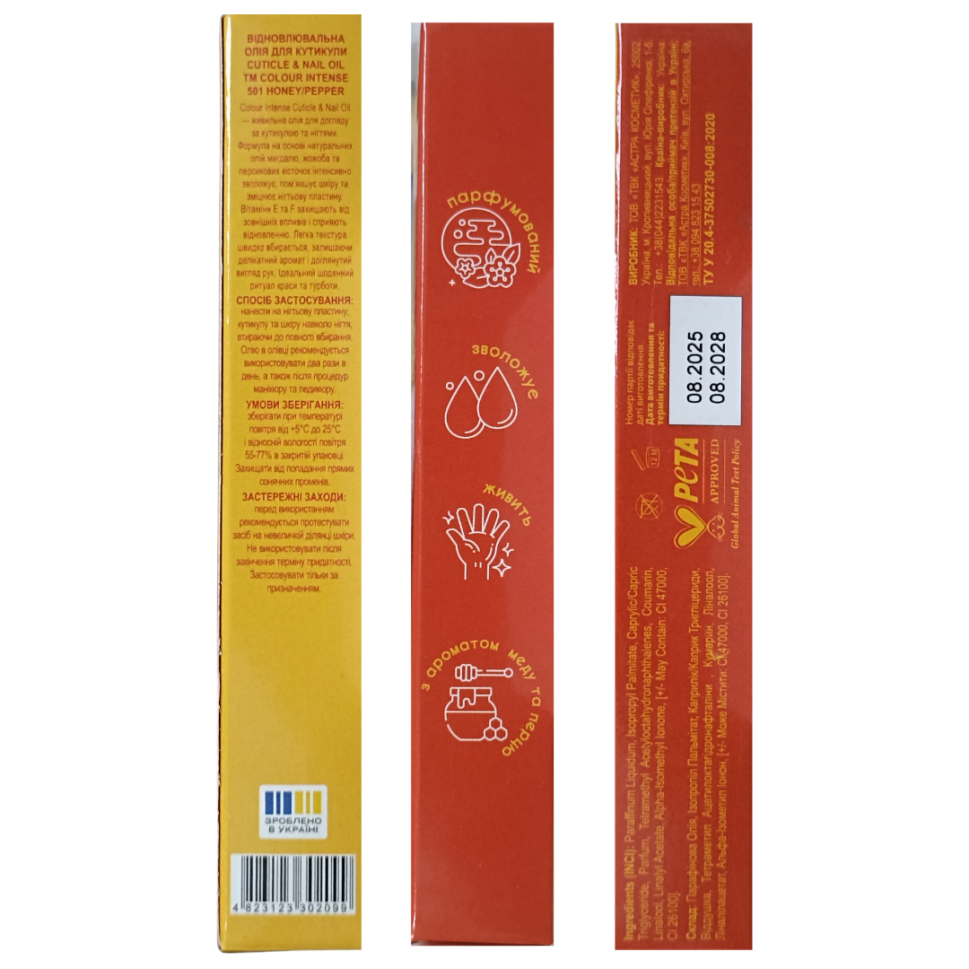 Парфумована олія для кутикули та нігтів Colour Intense Cuticle & NailПарфумована олія для кутикули та нігтів допоможе зберігати руки красивими та доглянутими. Формула на основі натуральних олій мигдалю, жожоба та персикових кісточок глибоко живить і зволожує нігтьову пластину та прилеглу шкіру, стимулюючи ріст здорових і міцних нігтів.Переваги:пом'якшує суху та пошкоджену шкіру кутикули, нігті;