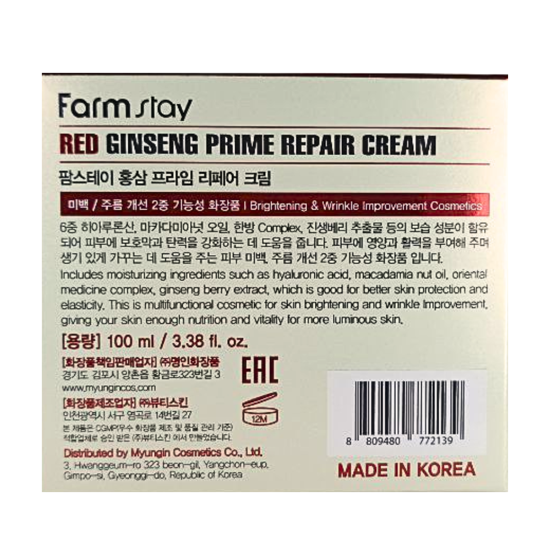 Відновлювальний крем для обличчя Farmstay Red Ginseng Prime Repair Cream з червоним женьшенемFarmstay Red Ginseng Prime Repair Cream — це крем для відновлення шкіри обличчя, створений на основі червоного женьшеню, шести видів гіалуронової кислоти та олії макадамії. Засіб інтенсивно живить, зволожує й допомагає повернути шкірі еластичність і свіжий вигляд.Унікальні властивості крему від корейського бренда Farmstay:освітлює і вирівнює тон обличчя, надаючи шкірі здорового сяйва;