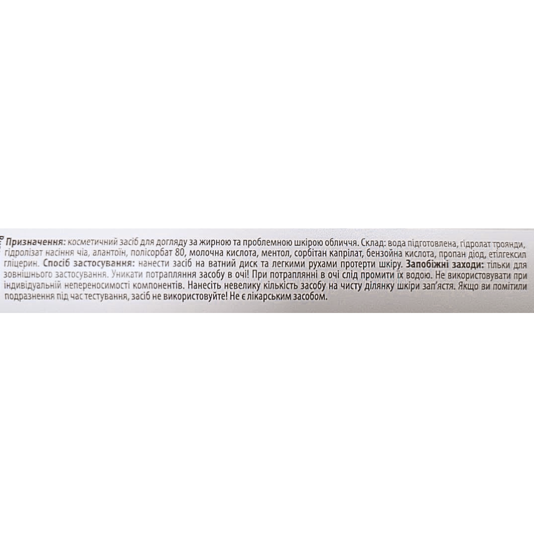 ментол — дарує приємну прохолоду, зменшує запалення й дискомфорт.Спосіб застосування:Наносити ватним диском на очищену шкіру обличчя й шиї або розпилити як спрей.