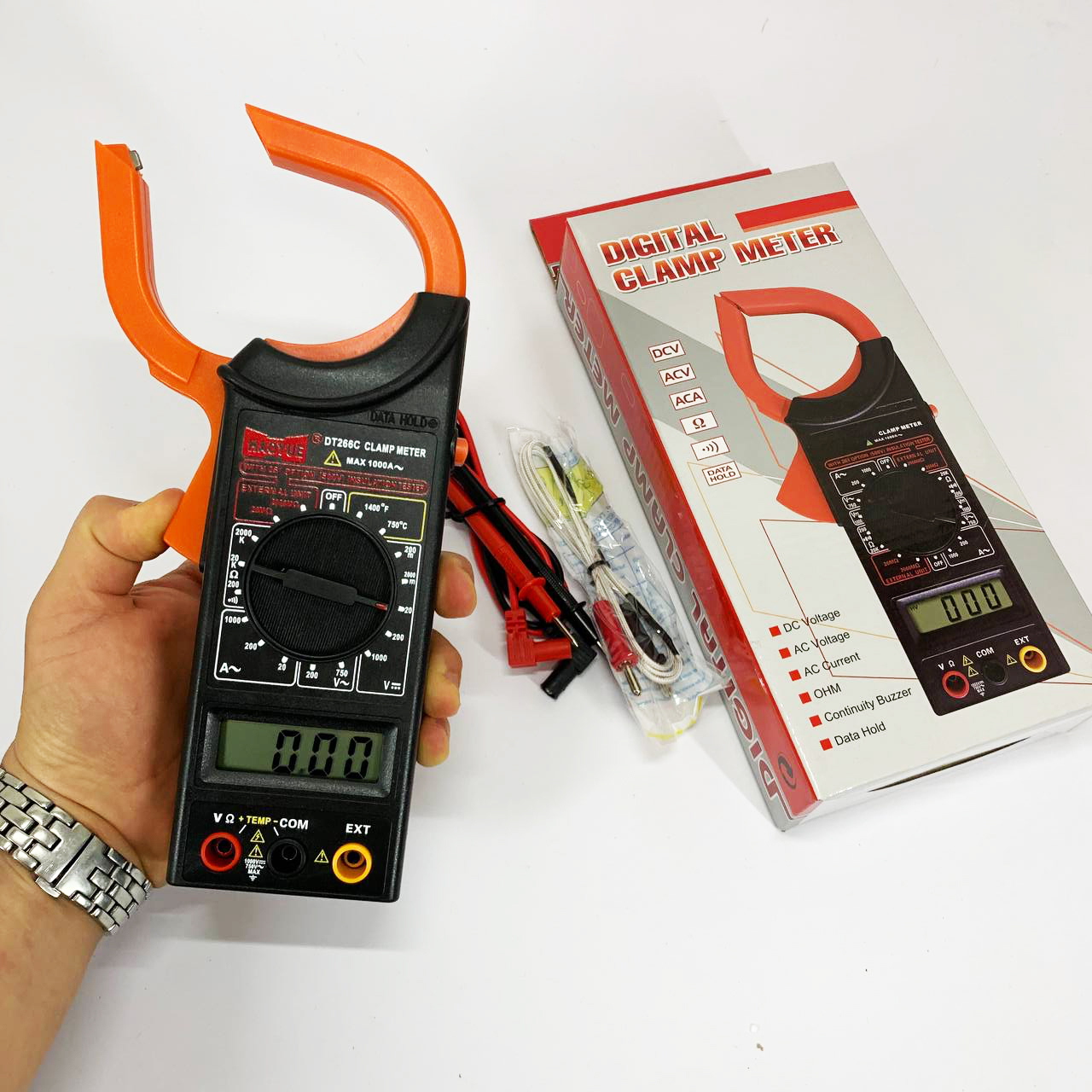 HAOYUE DT266C дозволяє безконтактно вимірювати змінний струм до 1000А за допомогою струмових кліщів, перевіряти напругу, опір, діоди, ізоляцію, а також фіксувати температуру з точністю до 1%. Пристрій підтримує функцію утримання даних, має індикатор навантаження та ергономічний корпус. Завдяки зручному чохлу мультиметр легко зберігати та транспортувати.