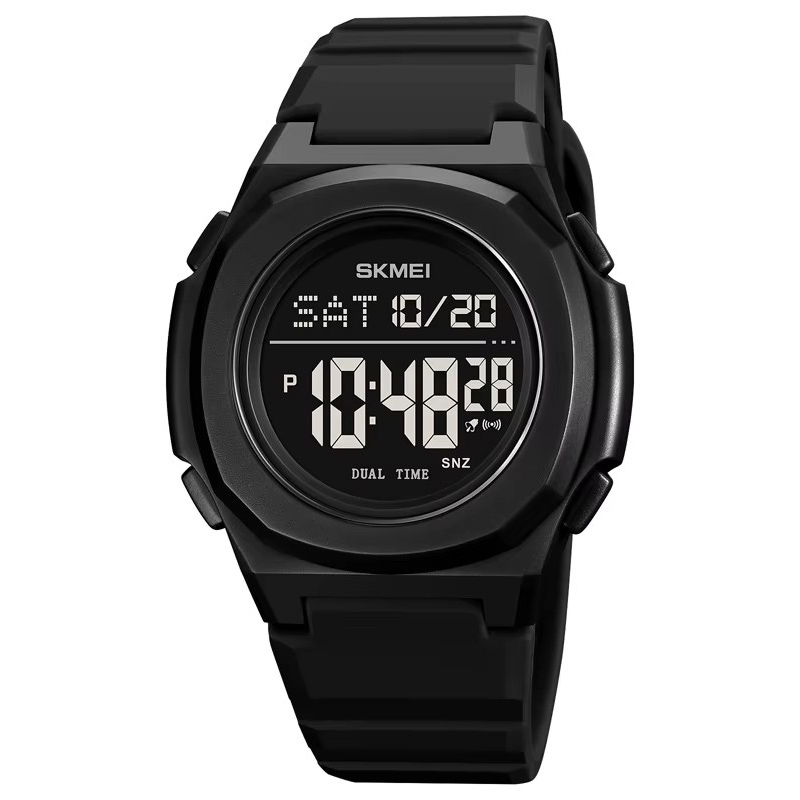 Модель оснащена корисними функціями, серед яких подвійний час, будильник із повтором (SNZ), секундомір, а також водонепроникність, що дозволяє використовувати годинник навіть під час дощу чи занять спортом. Це ідеальний вибір для активних людей, які шукають практичний та стильний аксесуар.