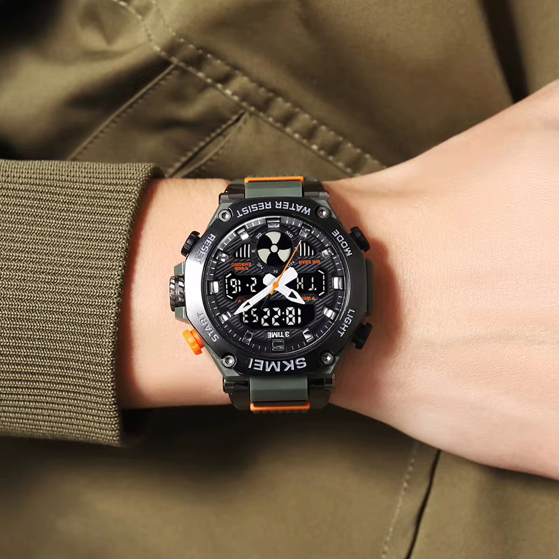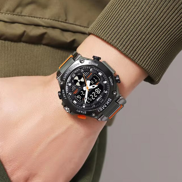 SKMEI 2223AG — це брутальний та функціональний чоловічий годинник, створений для екстремальних умов та активного стилю життя. Його агресивний дизайн поєднує в собі корпус з металевими вставками, армований зелений ремінець та яскраві елементи управління, які додають годиннику характеру. Візуально модель виглядає потужно і при цьому має зручну компоновку дисплеїв — аналогових та цифрових.