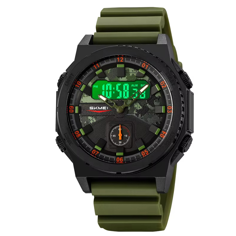 Годинник SKMEI 2355AG — це вдале поєднання брутального стилю, функціональності та витривалості. Завдяки комбінації аналогового та цифрового дисплея, ця модель дозволяє зручно слідкувати за часом у будь-яких умовах. Захисний корпус із міцного пластику та силіконовий ремінець у кольорі хакі роблять цей аксесуар ідеальним для активного способу життя, тренувань, подорожей або військового стилю.