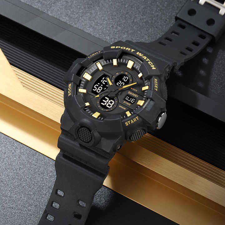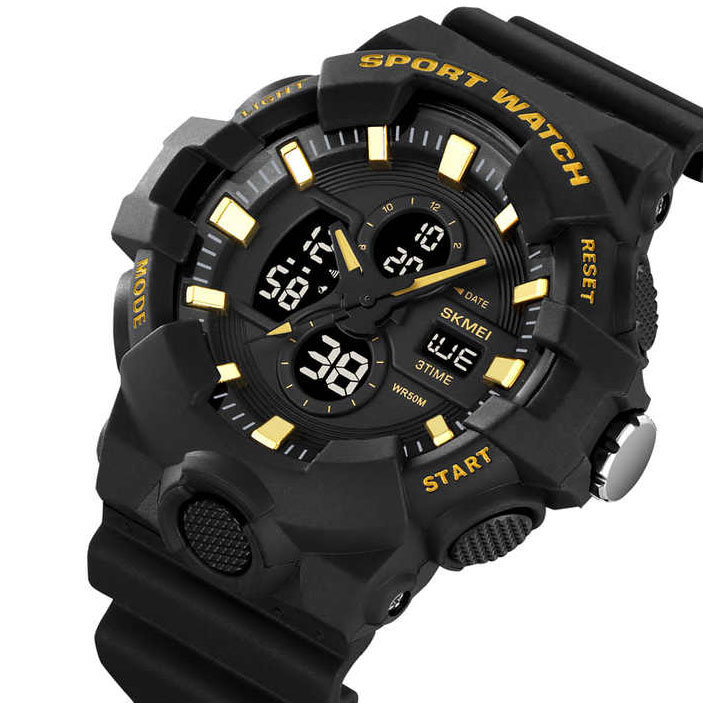 SKMEI 2117GD — це ефектний спортивний годинник, який поєднує масивний корпус, насичене підсвічування і золотисті акценти, що додають преміального вигляду. Завдяки комбінації аналогових стрілок і цифрового дисплея з глибоким синім підсвічуванням, модель виглядає сучасно та технологічно. Лаконічна форма корпусу та захисна конструкція роблять цей годинник чудовим вибором для активного стилю життя.